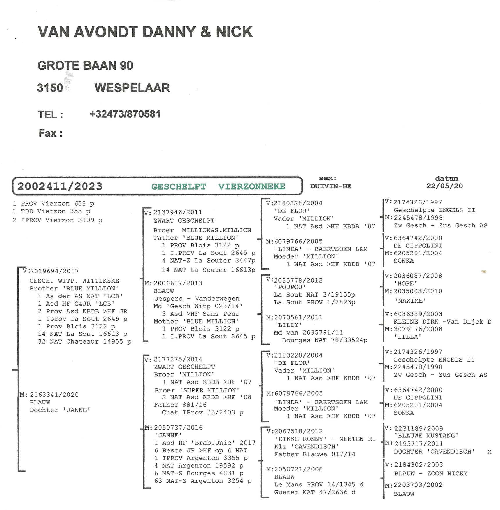 Op de eerste interprovinciale vlucht vanuit Vierzon deden de jaarlingen van Nick & Danny Van Avondt het fantastisch. Ze winnen niet alleen 1ste Provinciaal tegen 638 jaarlingen maar ook 3de en 8ste, in totaal winnen ze 12 prijzen van hun 15 duiven. Opnieuw is het hier de lijn van “Million” & “Super Million” die nog steeds de rode draad vormen in deze kolonie.