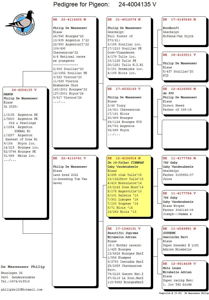 Philip: “In 2009 heb ik mijn eerste hoklijst ingevuld. Zoals iedere beginnende liefhebber werd er snelheid (150km) en halve fond (300km) gespeeld. Ik deed het vooral met duiven van Rene Sterckx. Aangezien er na een aantal jaren het aantal deelnemende duiven op deze vluchten daalde werd er besloten om onze pijlen meer op de grote halve fond, lees nationale vluchten, te richten. Het moet 2011 geweest zijn dat we contact namen met Gaby Vandenabeele en we mochten 16 ringen naar Dentergem brengen. Toen deze bij Gaby afgehaald werden kregen ze allen een bak op het kweekhok toegewezen en we kunnen na enkele jaren stellen dat dit toch geen verkeerde investering was. In 2019 wonnen we met “De Finman” de 1e Nationale asduif KBDB jonge duiven op de nationale vluchten en hij is een product uit de Vandenabeele duiven. De “De Finman” werd verkocht naar het verre oosten, maar op het kweekhok hebben we wel nog enkele kinderen zitten. Toeval of niet maar Tom Van den Berghe wint op dezelfde vlucht 1e provinciaal Argenton oude duiven met een rechtstreekse duif van ons hok…een kleindochter van “De Finman”.