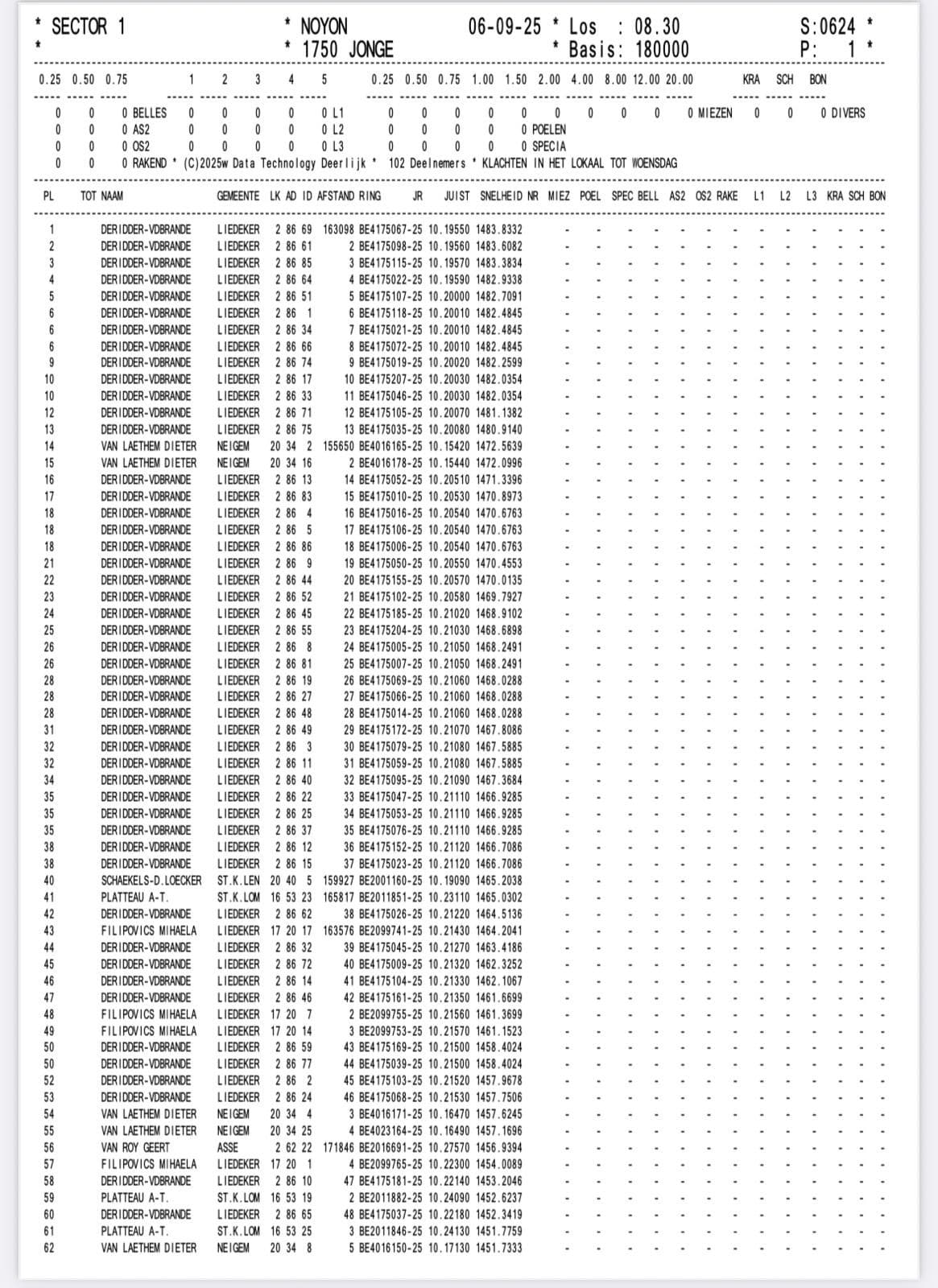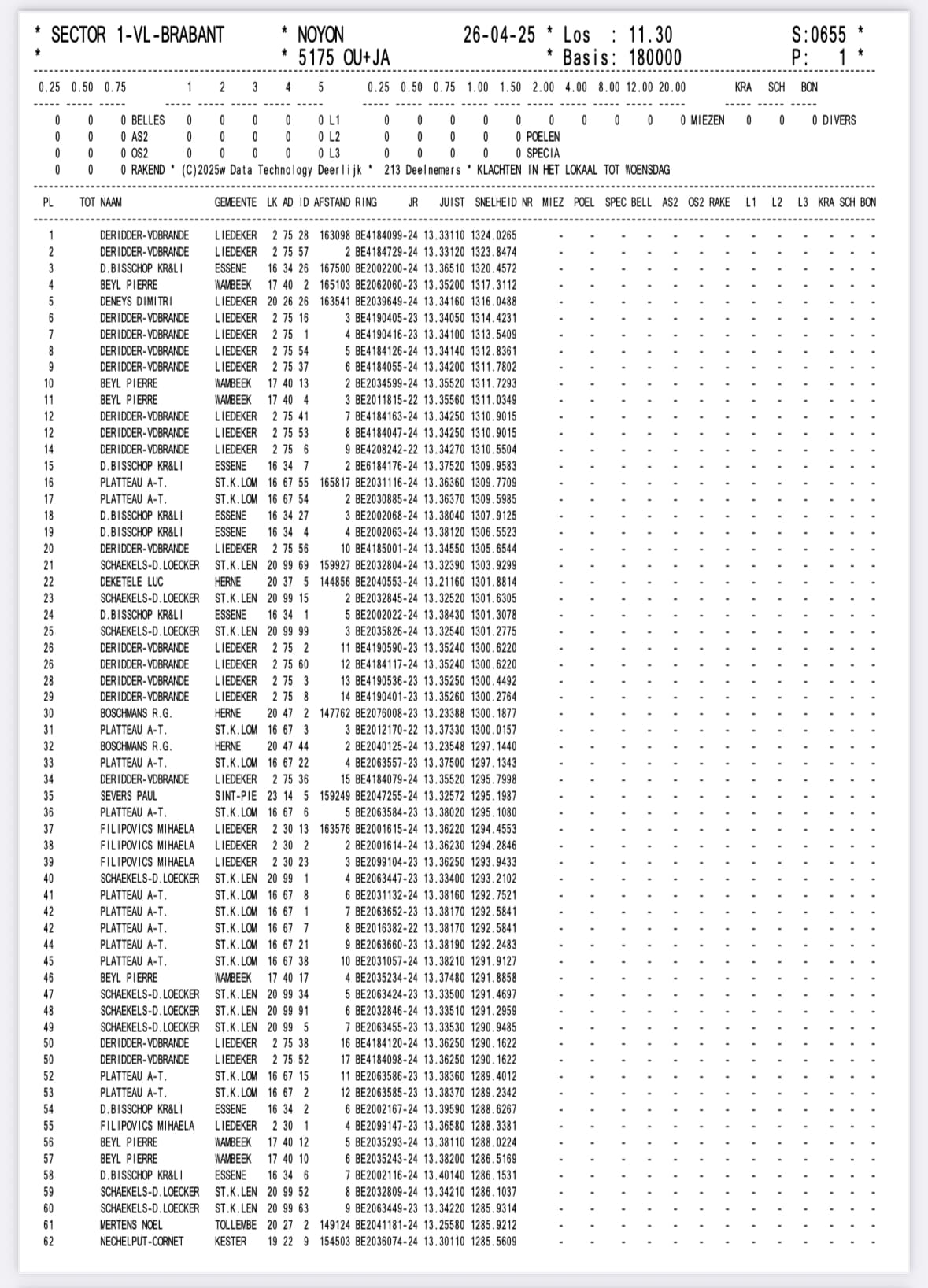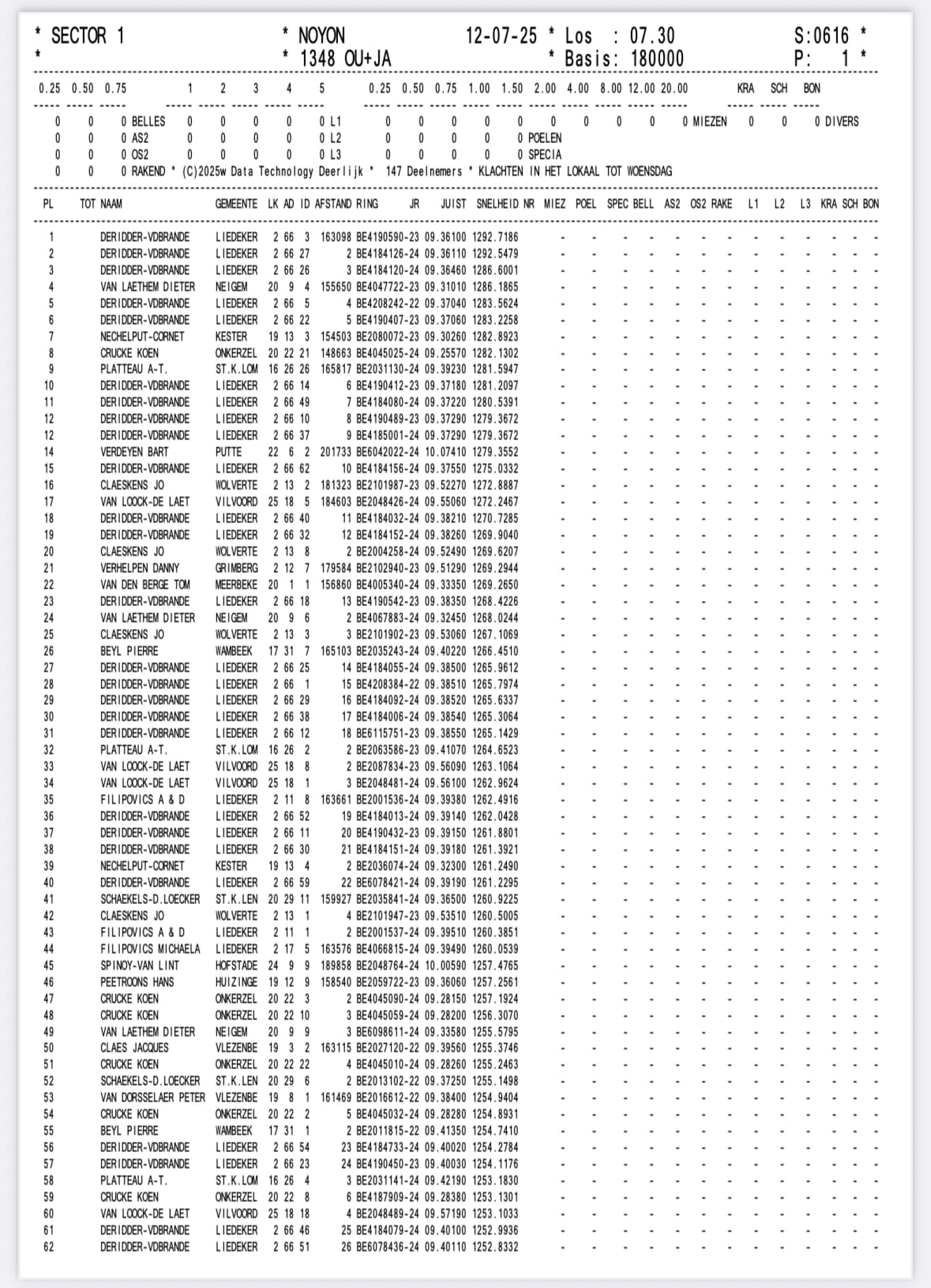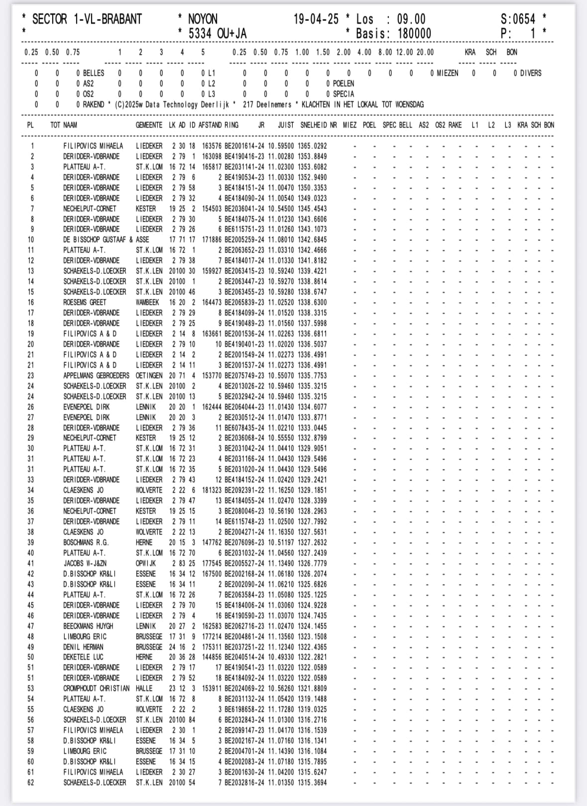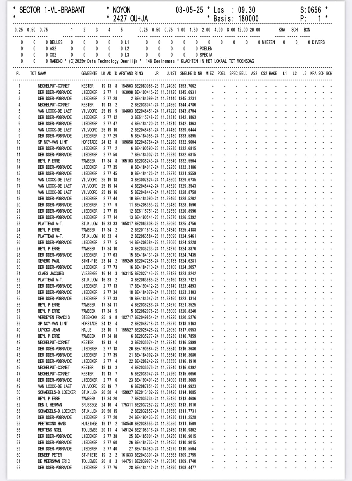Ook met de jonge duiven worden er knaluitslagen op papier gezet. Als voorbeeld nemen we de uitslag van 6/09/25. Noyon 1.750 jonge duiven – 85 mee: