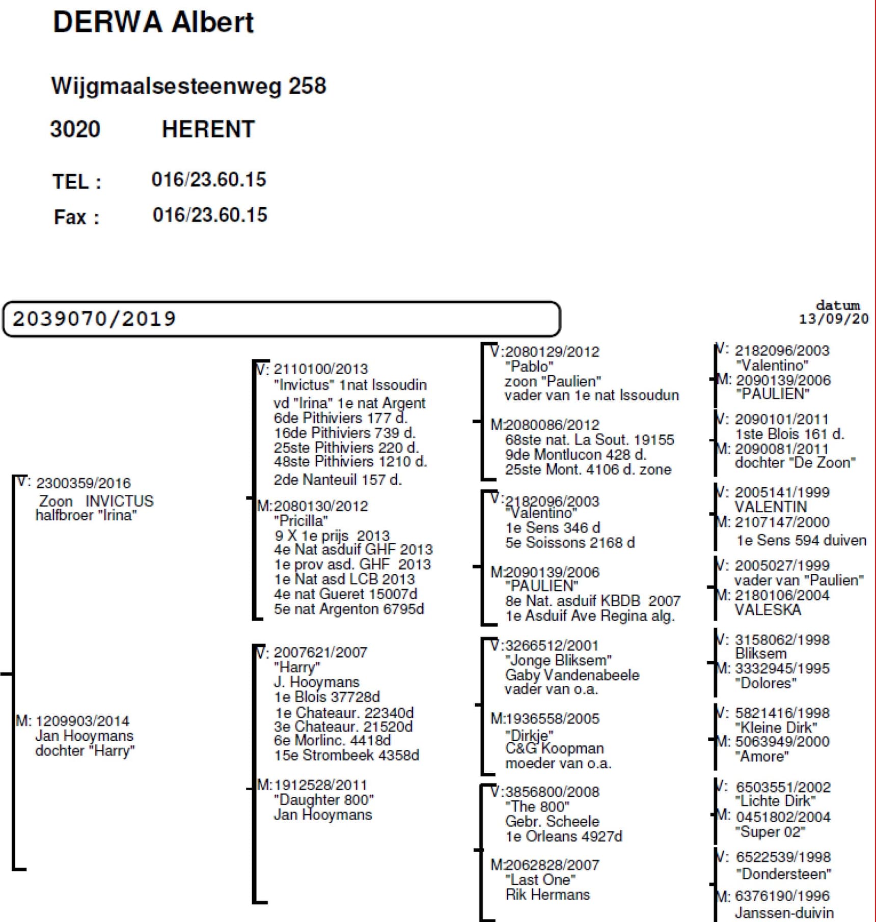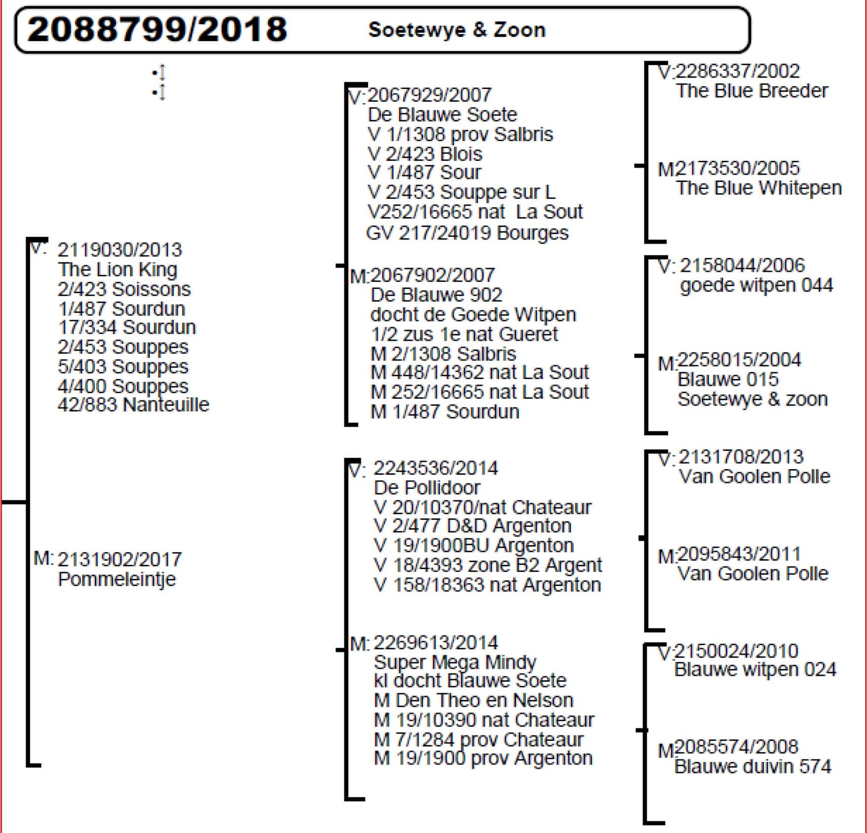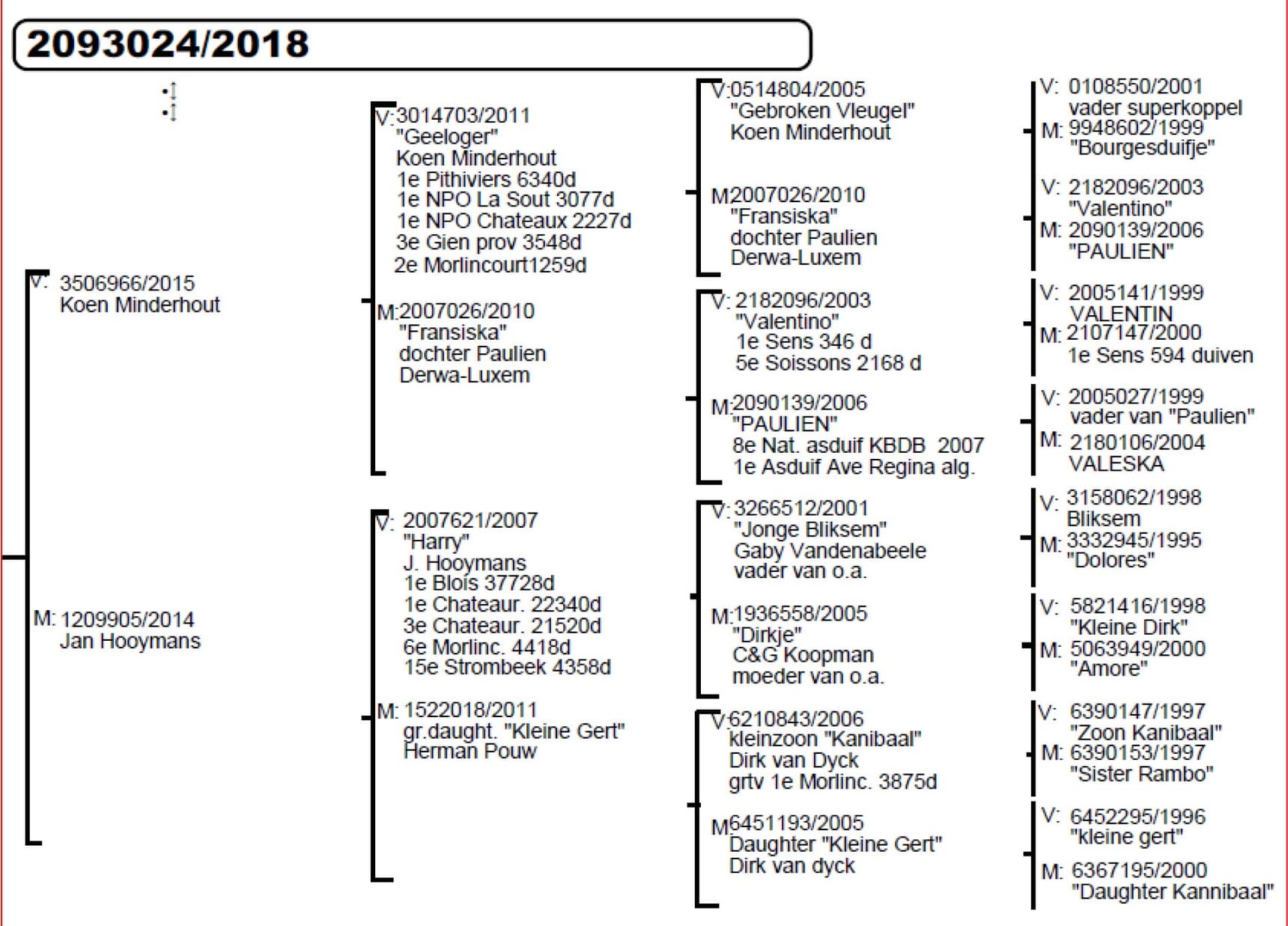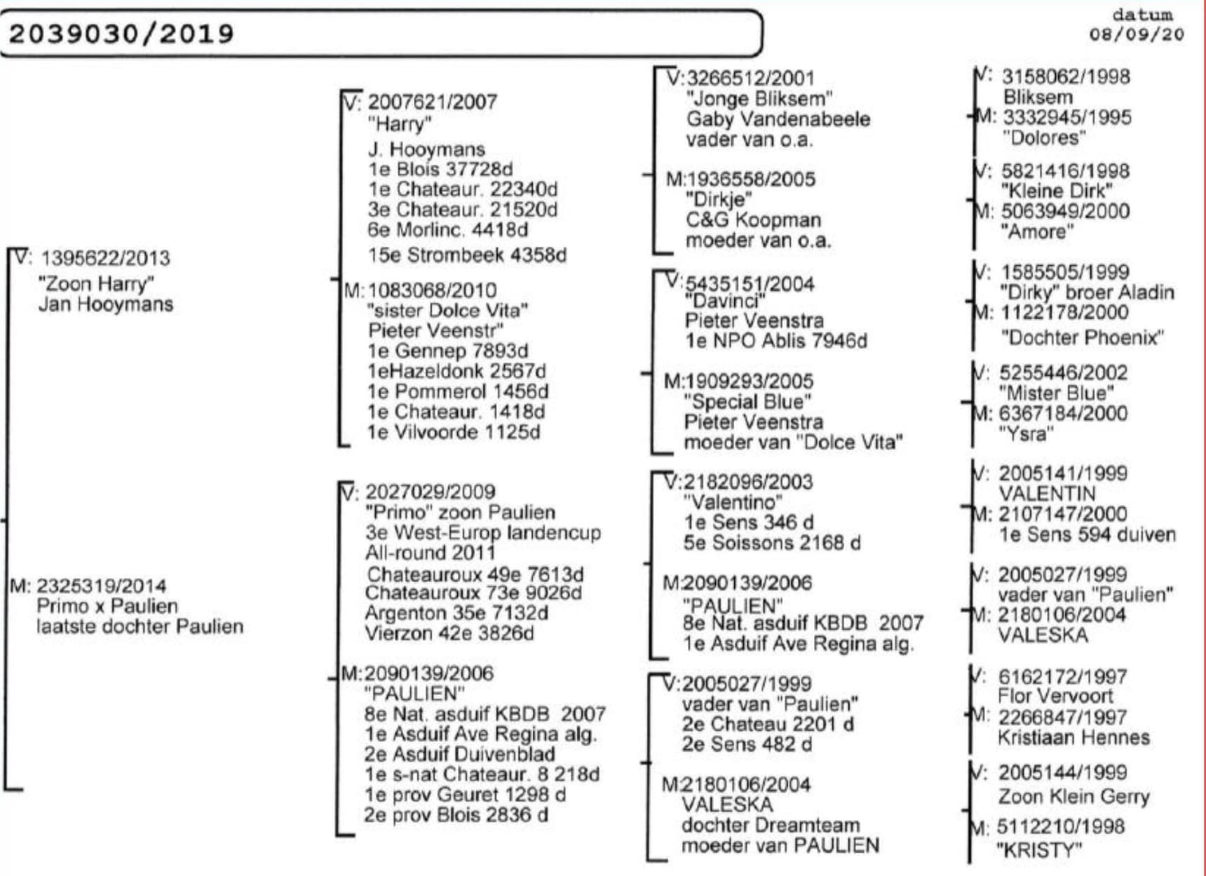 Als we even de de stamopbouw een beetje doorlopen begint alles met het topkoppel “Valentino” x “Paulien”. Deze hebben gezorgd voor een bloedlijn die generatie na generatie topduiven kan verder kweken. We sommen enkele kinderen “De Zoon” , “Pricilla” en “Primo” op maar er zijn er nog veel meer !