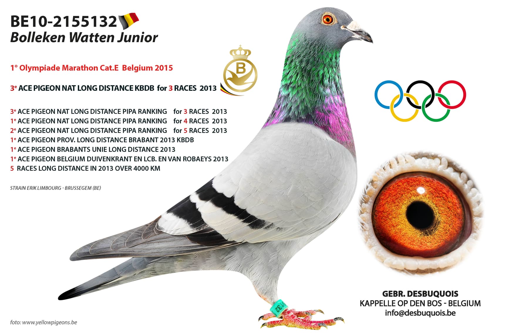 “Bolleke Watten” x “Dikke Blauwe” werden de ouders van “Bolleke Watten Junior” B10-2155132 . Die werd 1e Olympiadeduif Marathon Boedapest 2015 en 3e Nat. Asduif Fond KBDB 2013.