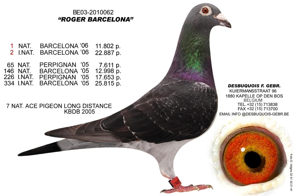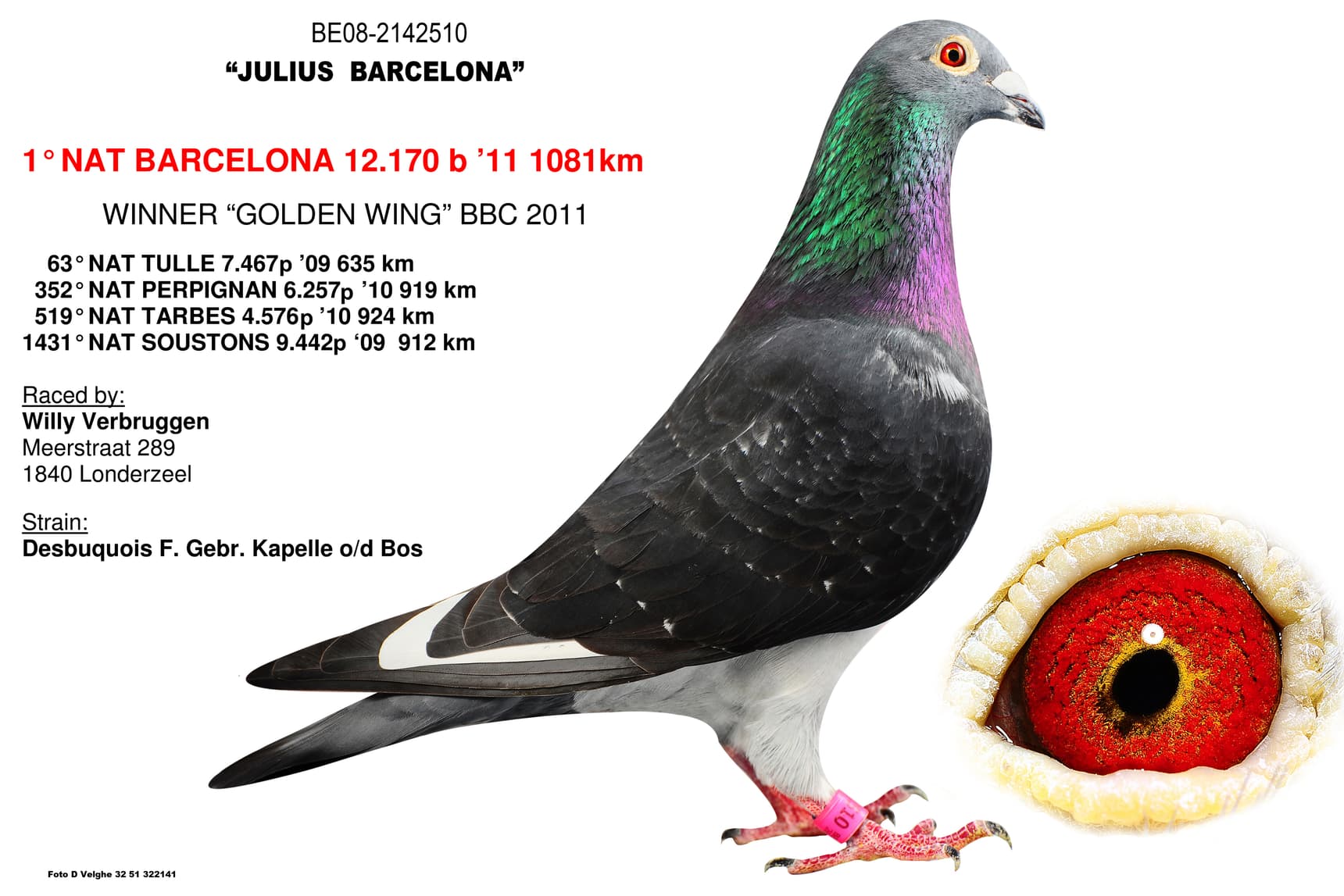 Dat niet alleen op eigen hok de Desbuquios-duiven in staat zijn om een 1e nationaal Barcelona te winnen, bewijst “Julius” (08-2142510). Deze goed gebouwde, zwarte witpendoffer met zeer zachte pluimen en een schitterend oog is een 100% Desbuquois-duif. Aan sportvriend Willy Verbruggen (Londerzeel) werd door de broers een koppel oude duiven geschonken en juist uit dit koppel werd de klasbak “Julius” geboren. Na zijn overwinning verhuisde “Julius” terug naar de hokken van Michel en Didier en ook hij is een unieke kweeklijn op de Desbuquois kweekhok.