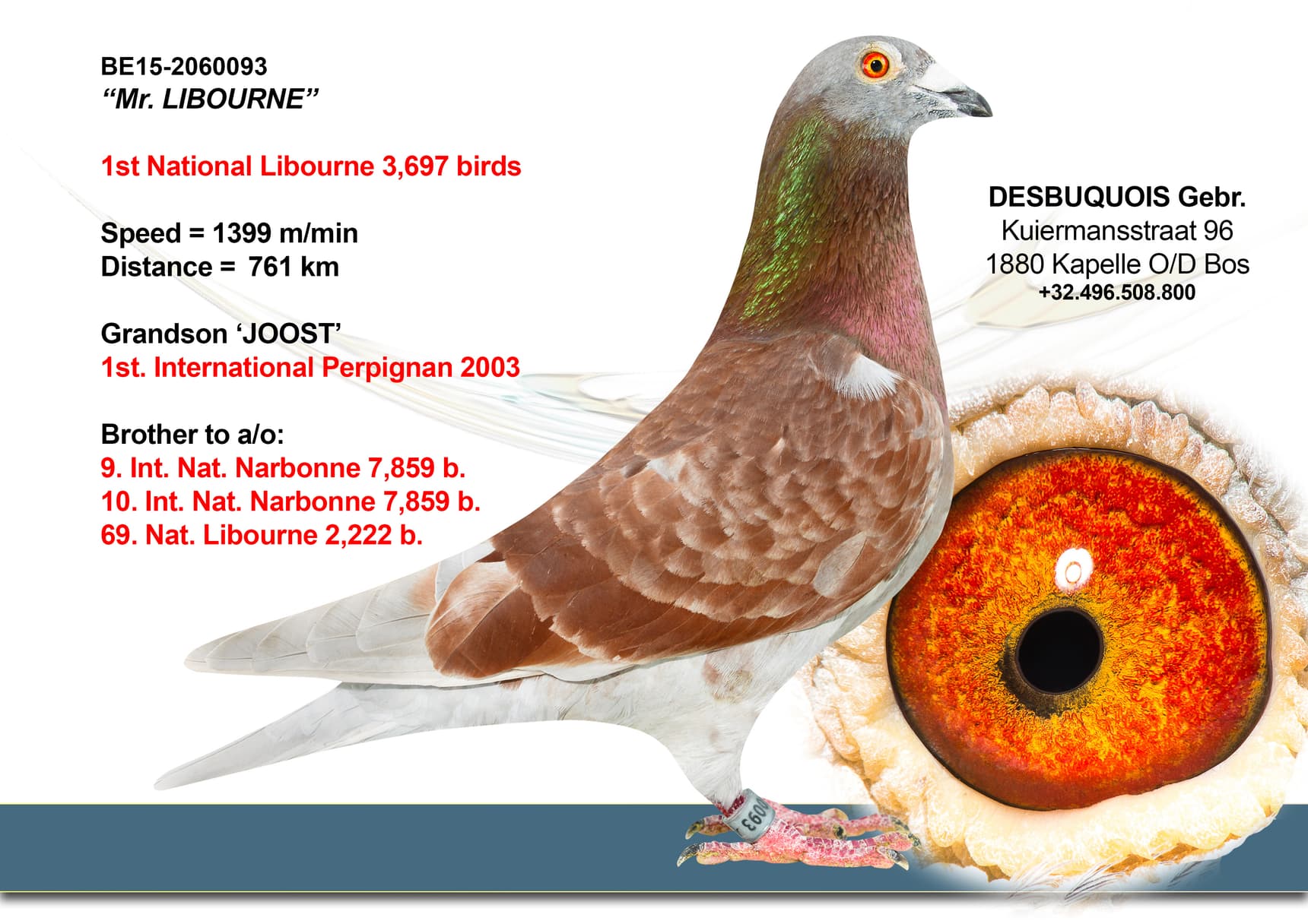 Langs moederszijde is “Mister Libourne” een kleinzoon van topper “Pedro” (B04-2010583 – won 6e Perpignan 3.796d. – 14e Perpignan 4.666d. en 28e Perpignan 6.765d.) en een kleinzoon “Beauty 85” (een dochter van nationale KBDB asduif “Lucky 85” – Limbourg Eric)