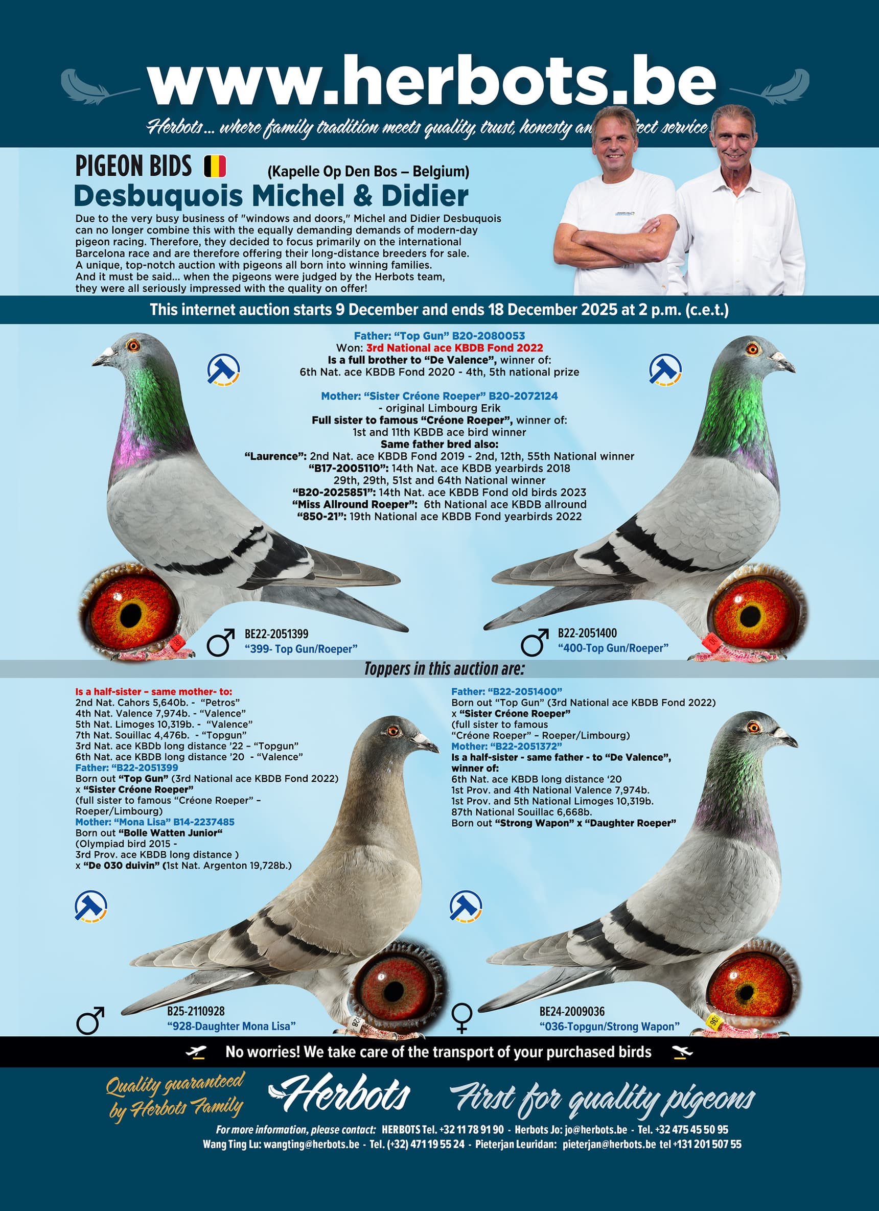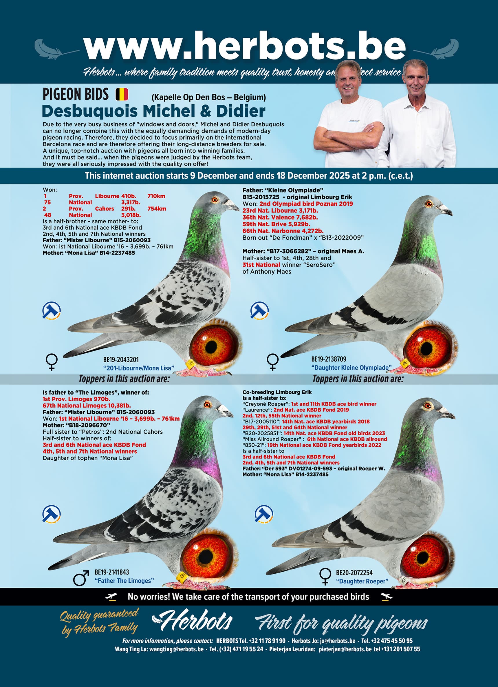 De familie Desbuquois heeft zich binnen de duivensport een stevige reputatie opgebouwd, vooral wanneer er hard te werken valt, bij zwaar labeur, lijken deze duiven niet af te stoppen. De duivensport anno 2025 vraagt veel aandacht/tijd en als liefhebber moet men het hele jaar door, 365 dagen op 365 dagen, inzet tonen. En net daar wringt het schoentje. Niet enkel de drukke zaak eist heel veel aandacht, maar ook de minder goede gezondheidstoestand van Didier – waardoor Michel meer werk heeft op het duivenhok - werkt ten nadele van het duivenspel. Michel en Didier zien ook dat ze te weinig tijd kunnen vrijmaken om het allemaal goed te doen en daarom werd er besloten om een groep duiven, allen geboren uit de bewezen kweeklijnen, van de hand te doen.