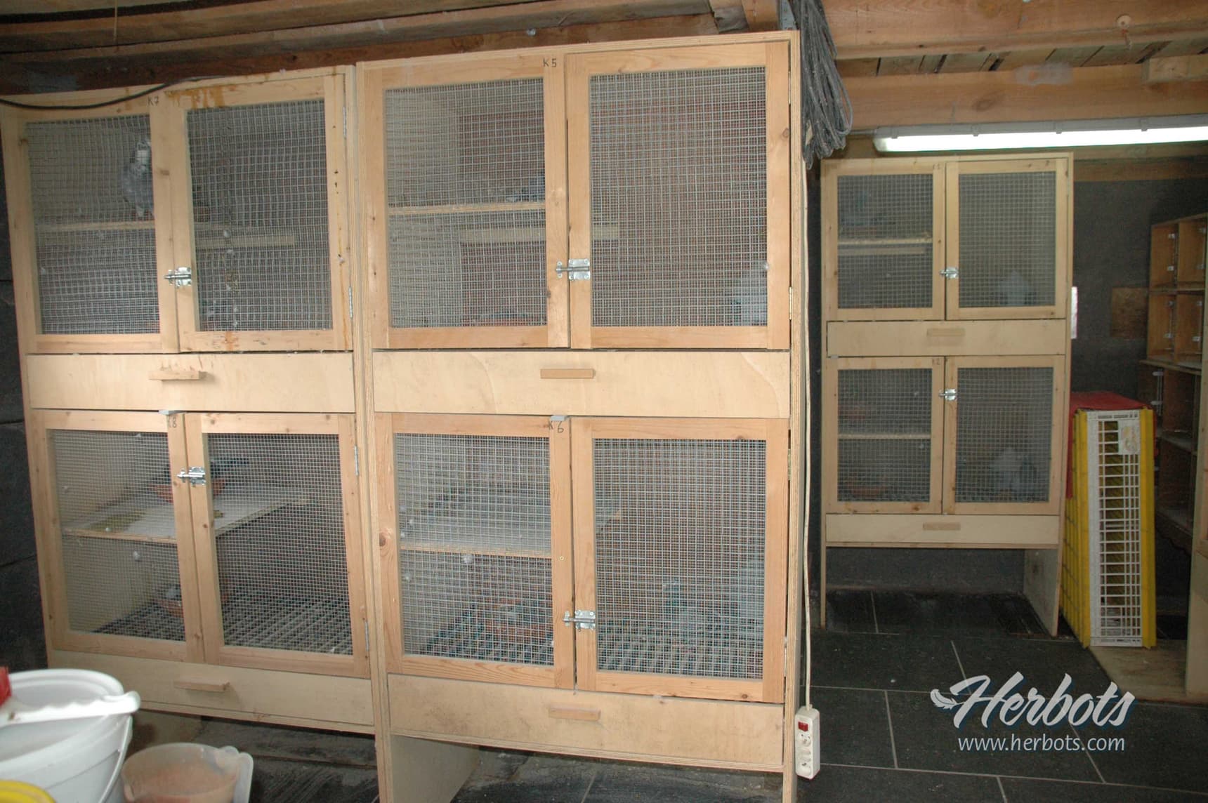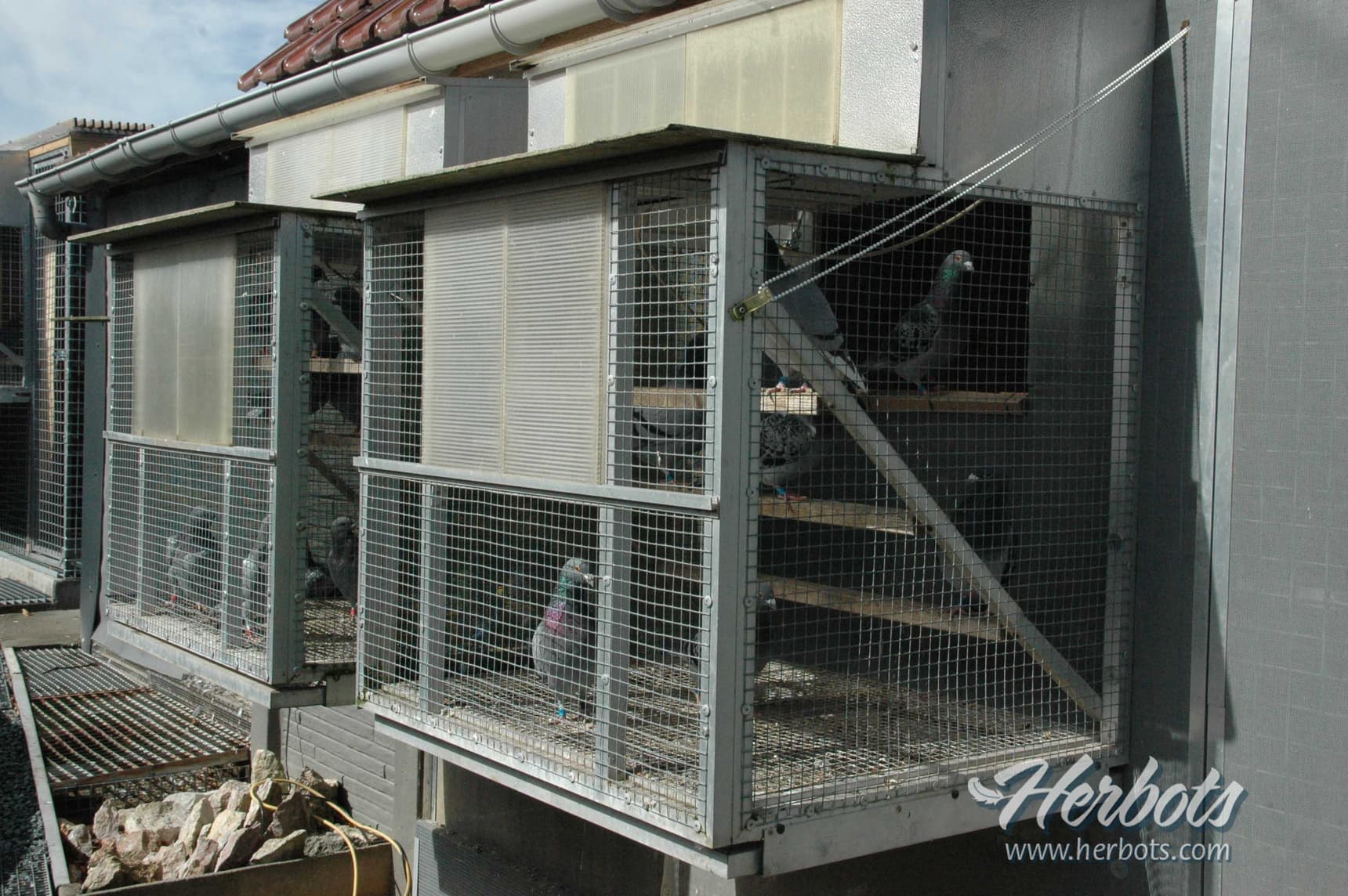 De oude en de jonge duiven worden gespeeld op 12 m vlieghokken. De ventilatie gebeurt door de twee metalen deuren (bodemroosters zoals in een volière) die bekleed zijn met windbreekgaas in de voorzijde van het hok. Aan de voorzijde van de hokken hangen er drie voorzetvolières. De wanden van de hokken zijn gemaakt met de klassieke betonplaten. Daartegen kwam een isolatie van 4 cm en de binnenzijde werd afgemaakt met houten platen.