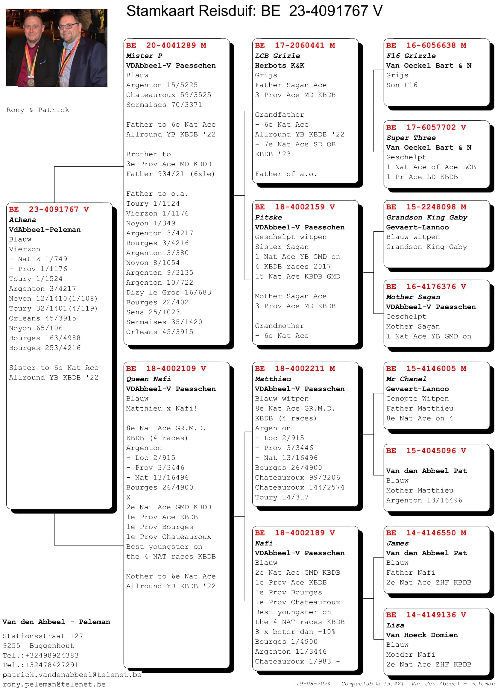 De stamboom van Athena spreekt voor zich: ze is een topduivin, met de juiste genen, die als jonge duif al uitstekende resultaten behaalde. Dit seizoen heeft ze al drie eerste prijzen gewonnen. Ze is tevens een volle zus van de 6de Nationale Asduif All-Round KBDB voor jonge duiven in 2022. Haar vader, een enorm mooie duif met dan nog eens de juiste afstamming en genen, is inmiddels de stamkweker van Patrick en Rony geworden. Intussen hebben ze uit diverse broers van "Mister P" diverse goede duiven gekweekt met als topper "De Jules" (Klik hier voor meer info) , de 7de nationale asduif snelheid 2023, bij Nechelput-Cornet. Zelf kweken ze in hun satelliethok in Brakel uit een andere broer (geleend van goede vriend Glen De Deyn) een duivin die al 3 x de eerste prijs uit Noyon wint.