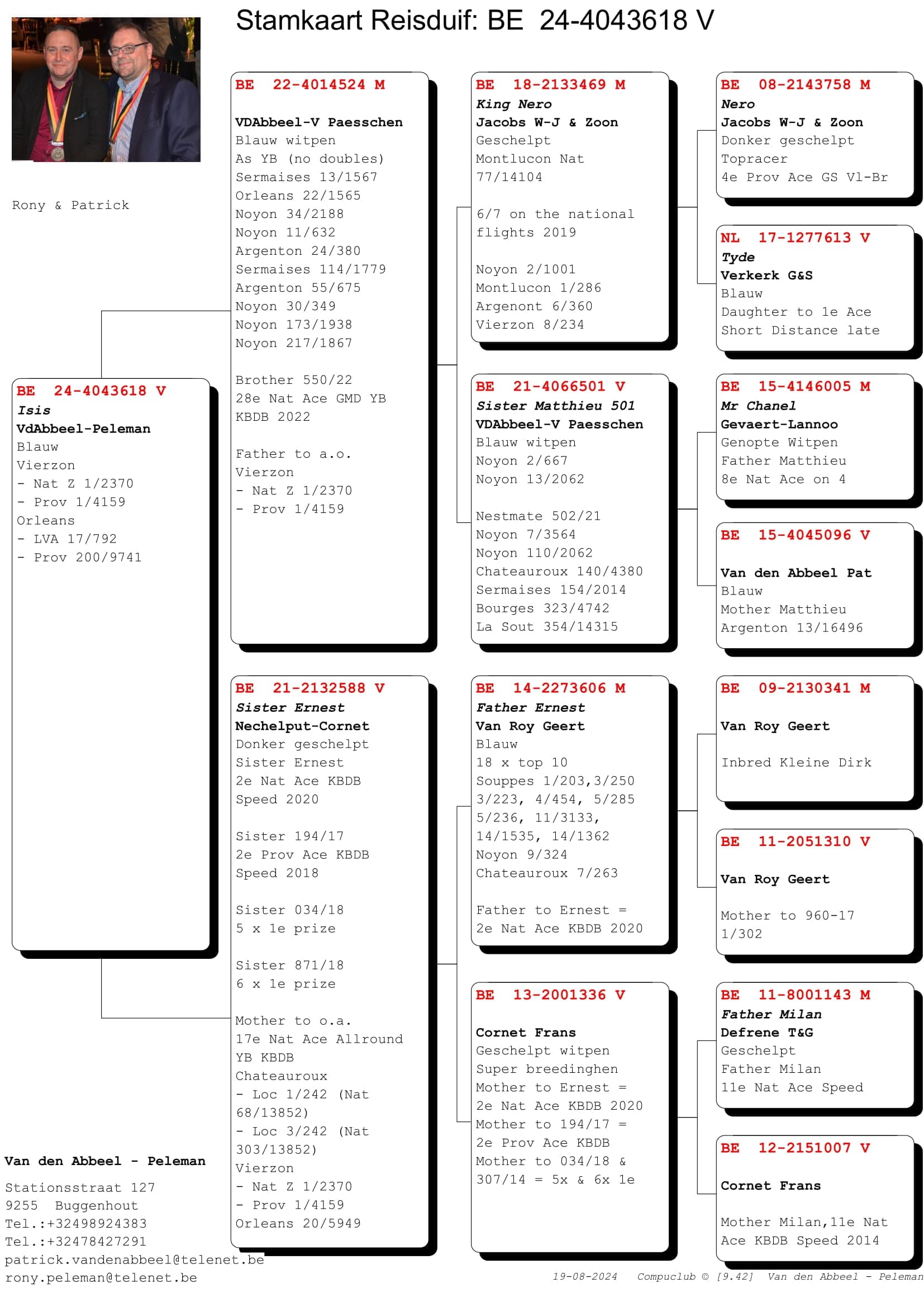"Isis" heeft een indrukwekkende stamboom. Haar vader komt uit de beroemde "King Nero"-lijn (Jacobs Willy-Jan en Jeroen) en de "Matthieu-lijn". Aan moederszijde brengt een zuster van "Ernest", de tweede Nationale Asduif Snelheid KBDB 2020 bij Nechelput-Cornet, de nodige klasse in de mix.