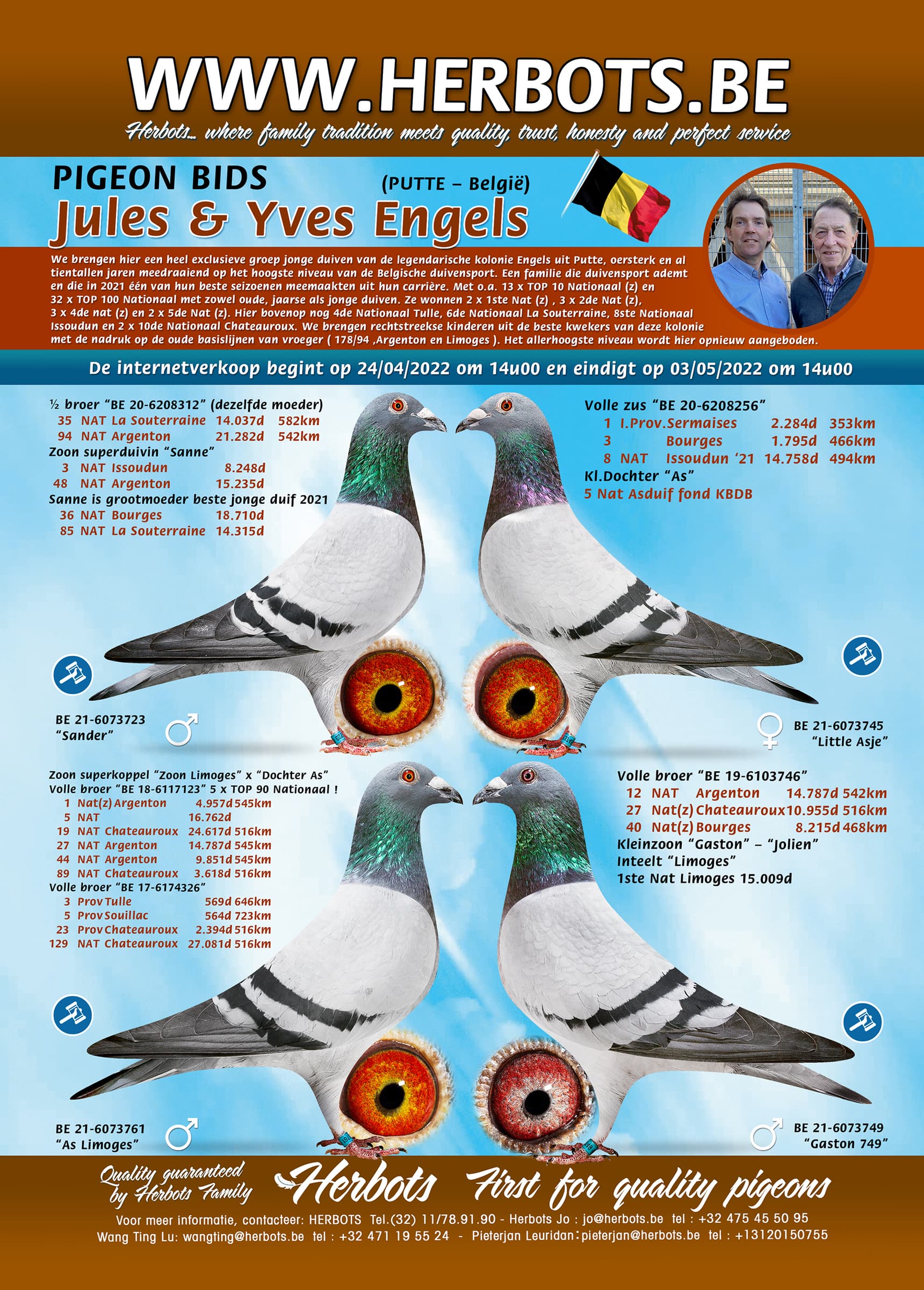 De familie Engels in Putte, jarenlange traditie van duiven en vooral ijzersterke duiven die met kopwind heel sterk presteren. Maar eigenlijk maakt de wind hen niet uit, als je ziet wat voor een boerenjaar ze hebben beleefd in 2021 kan je alleen maar zeggen chapeau en op naar 2022. Jules & Yves waren constant te vinden in de top van de uitslagen op alle vluchten en winnen 1 x 1ste en 3 x 2de Nationaal Zone zonder al hun andere topprijzen nationaal te vermelden.