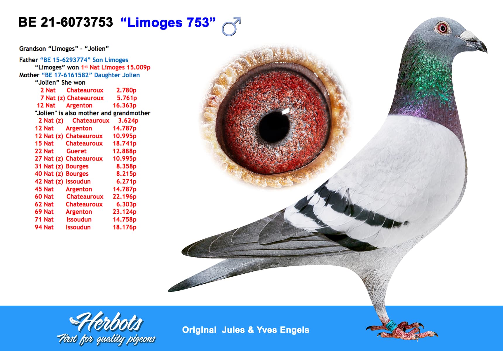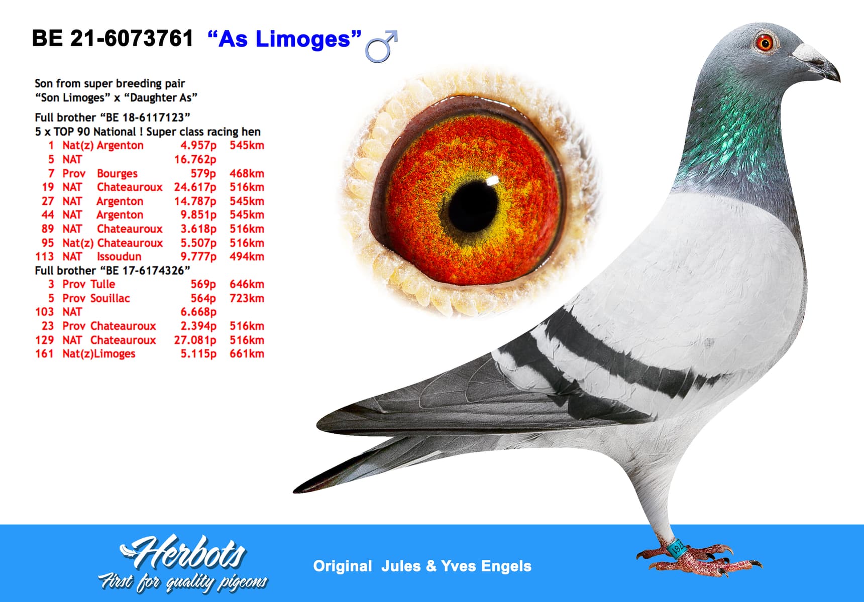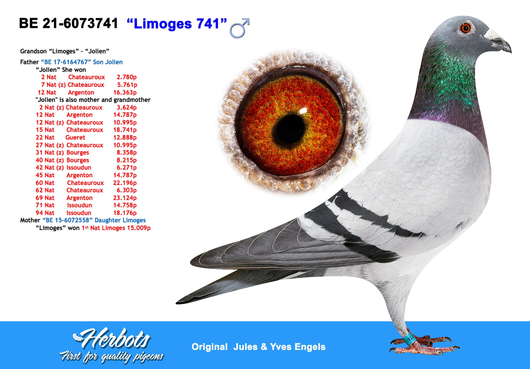 De bloedlijn waar ten huize Engels heel veel van verwacht werd en ze het ook dadelijk waar maken. “De Limoges” zelf was een superdoffer die 1ste Nationaal Limoges tegen 15.009 duiven won op de eerste fondklassieker van het seizoen.