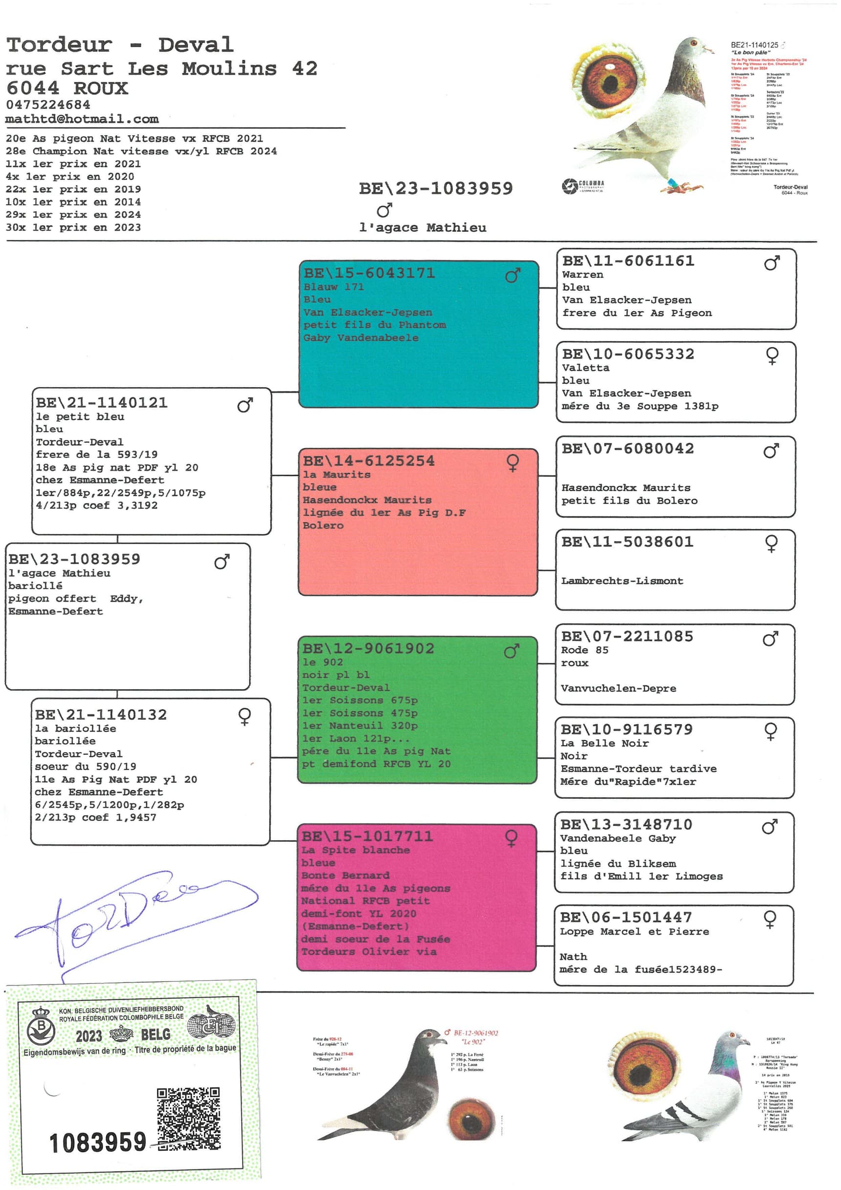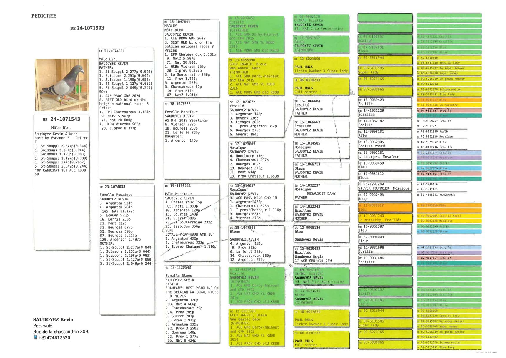 Hij komt rechtstreeks van de kolonie Kévin Saudoyez (Péruwelz) en in zijn afstamming vinden we zowel langs vaders- als moederszijde het beroemde stamkoppel van het hok Saudoyez terug (BE13-9039452 x Gold Ingrid)