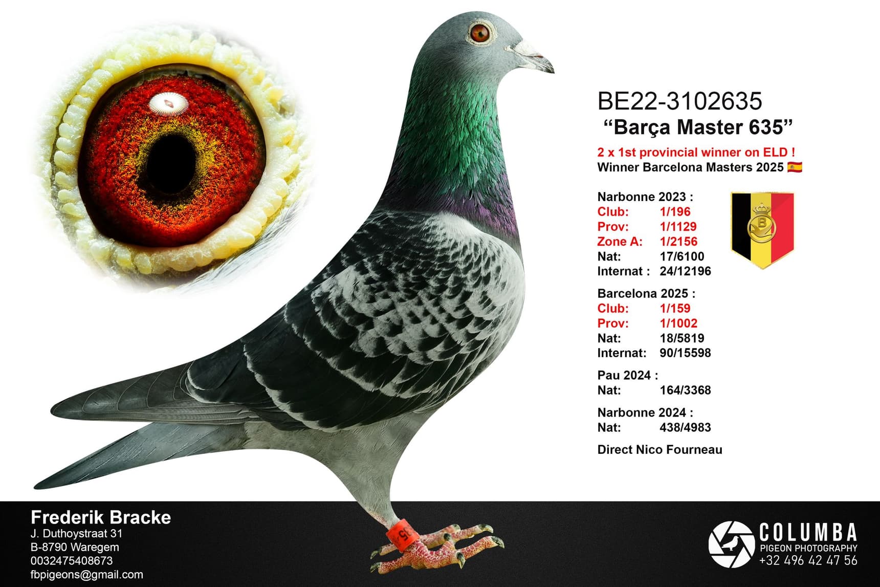 Op de prestigieuze internationale Barcelona-vlucht heeft Frederik Bracke uit Waregem opnieuw van zich laten horen. Met zijn doffer BE22-3102635 wist hij de 1ste provinciale prijs in West-Vlaanderen te veroveren tegen 1002 duiven, en dat met verve: nationaal werd deze klasbak ook nog eens 18e tegen 6167 duiven.