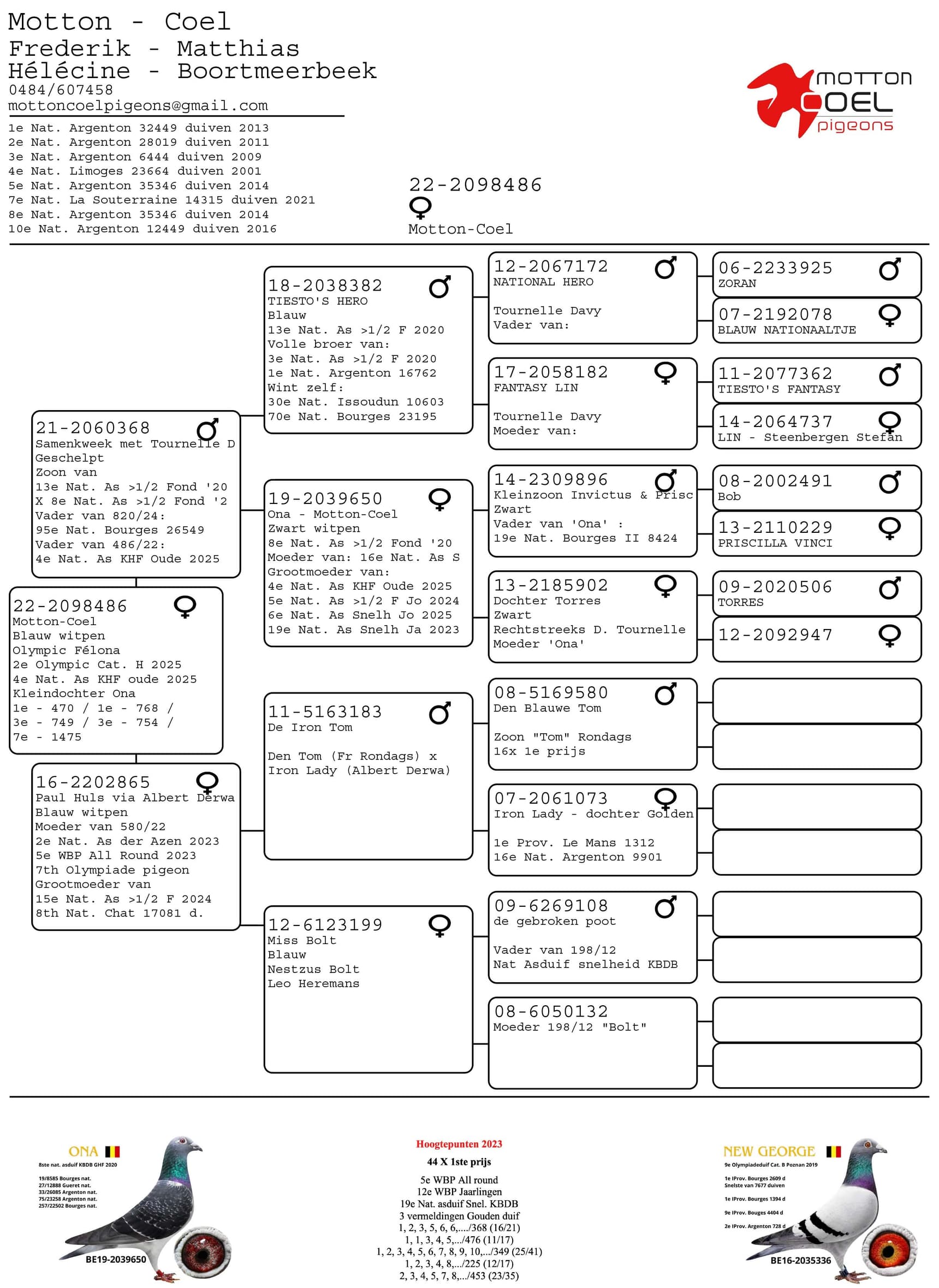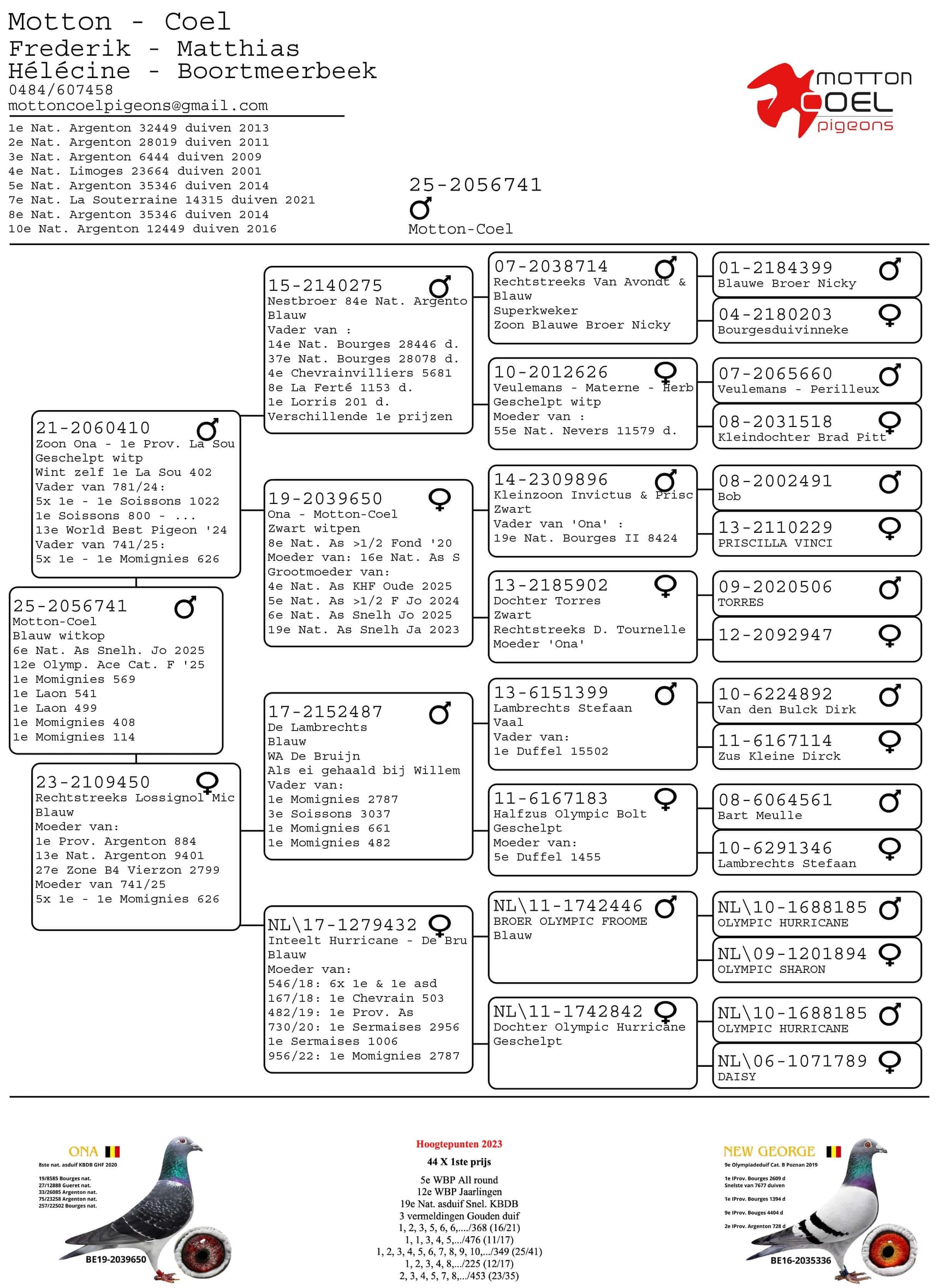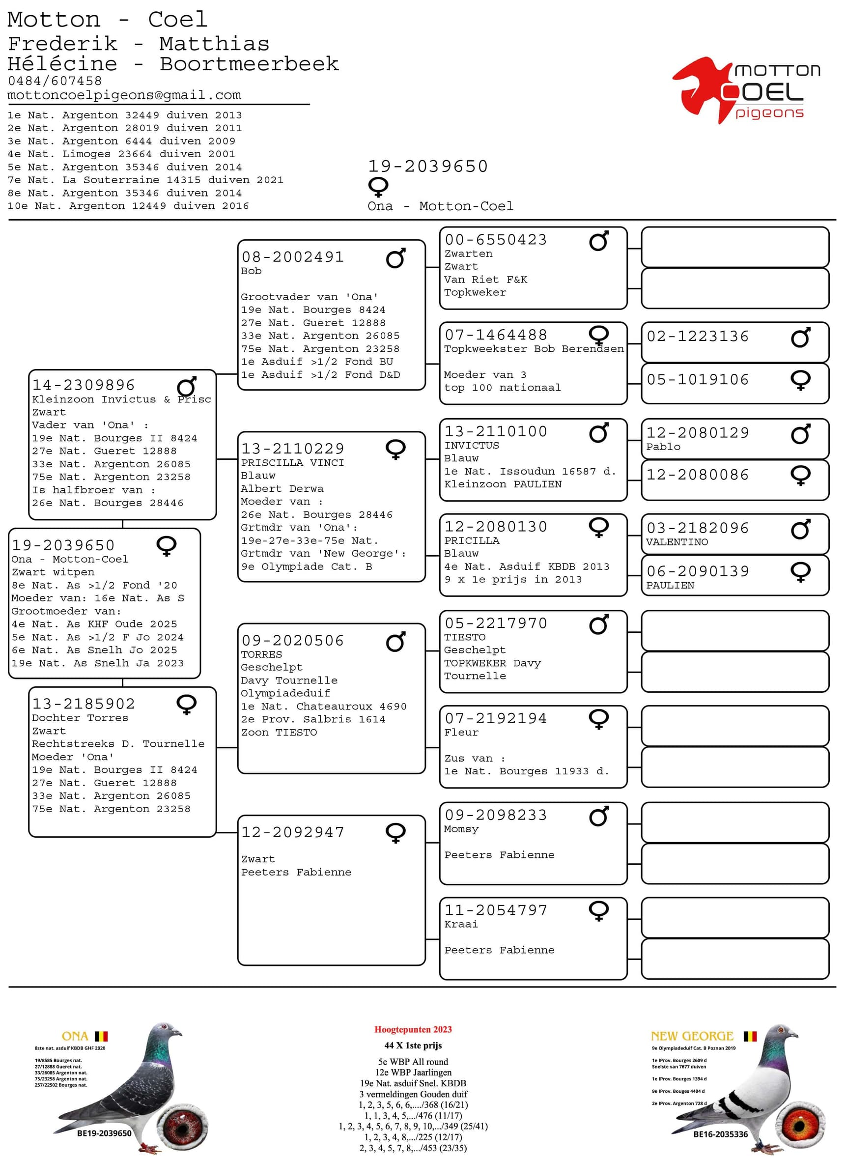 De meest invloedrijke is zonder twijfel de Ona lijn. “Ona”, geboren in 2019 uit de eerste gezamenlijke kweek, werd 8e Nationale Asduif KBDB Grote Halve Fond 2020 jaarlingen en werd gespeeld door Matthias in Boortmeerbeek. Haar afkomst combineert de oude soort van Matthias met Priscilla Vinci, een dochter uit Invictus x Priscilla van Albert Derwa, gekoppeld tegen een dochter van sterkweker Torres van Davy Tournelle.