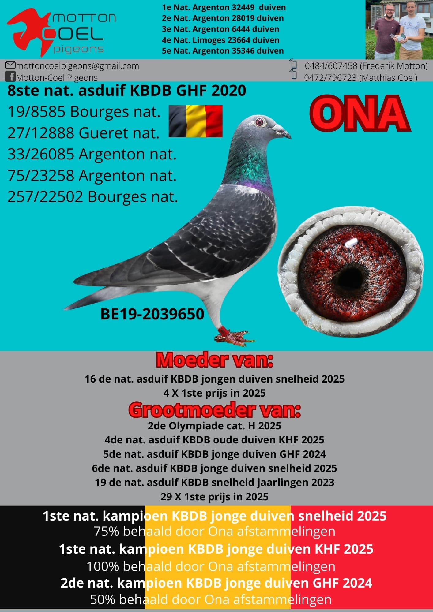 - Een rechtstreekse zoon van Ona werd 16e Nationale Asduif KBDB Snelheid Jonge duiven 2025 maar ging jammergenoeg verloren op één van de laatste wedstrijden in augustus.