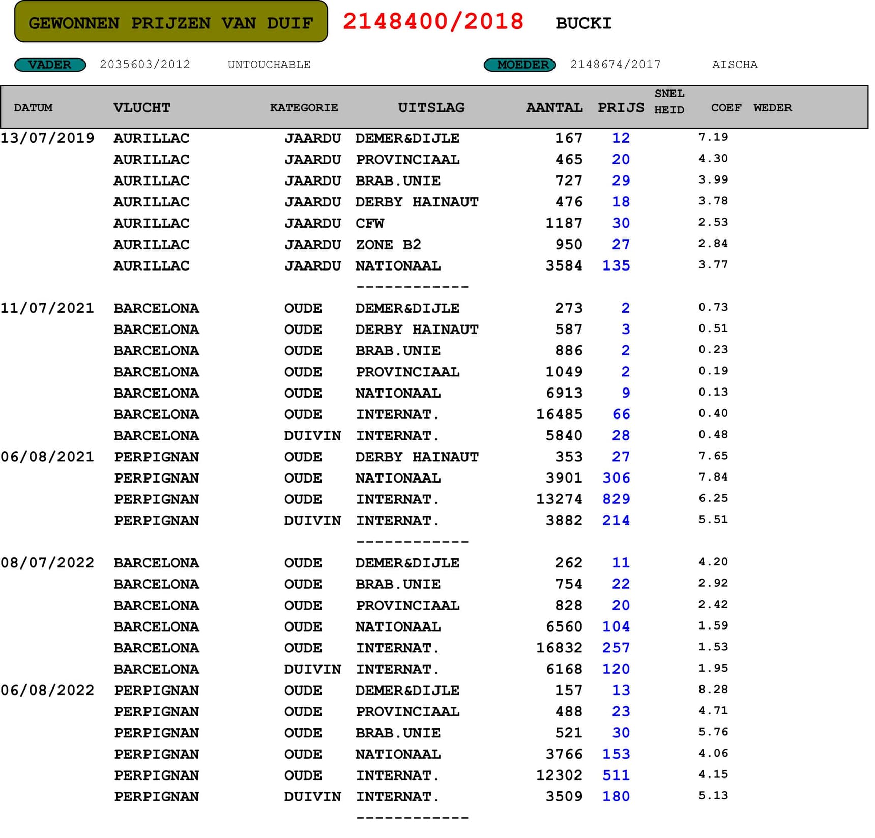 Over een periode van 10 jaar 100 prijzen van 218 ingezette duiven goed voor 45,87% prijs nationaal