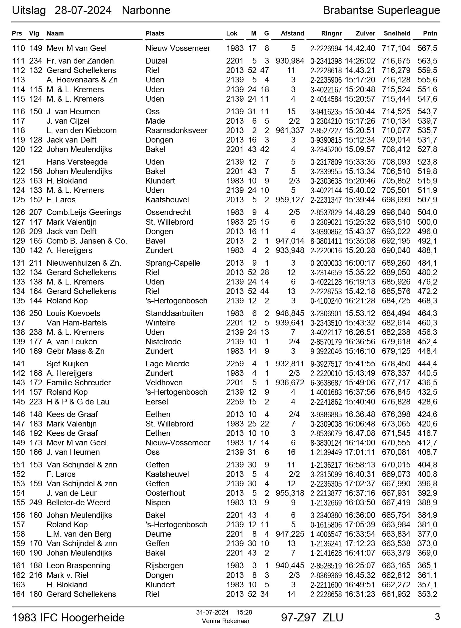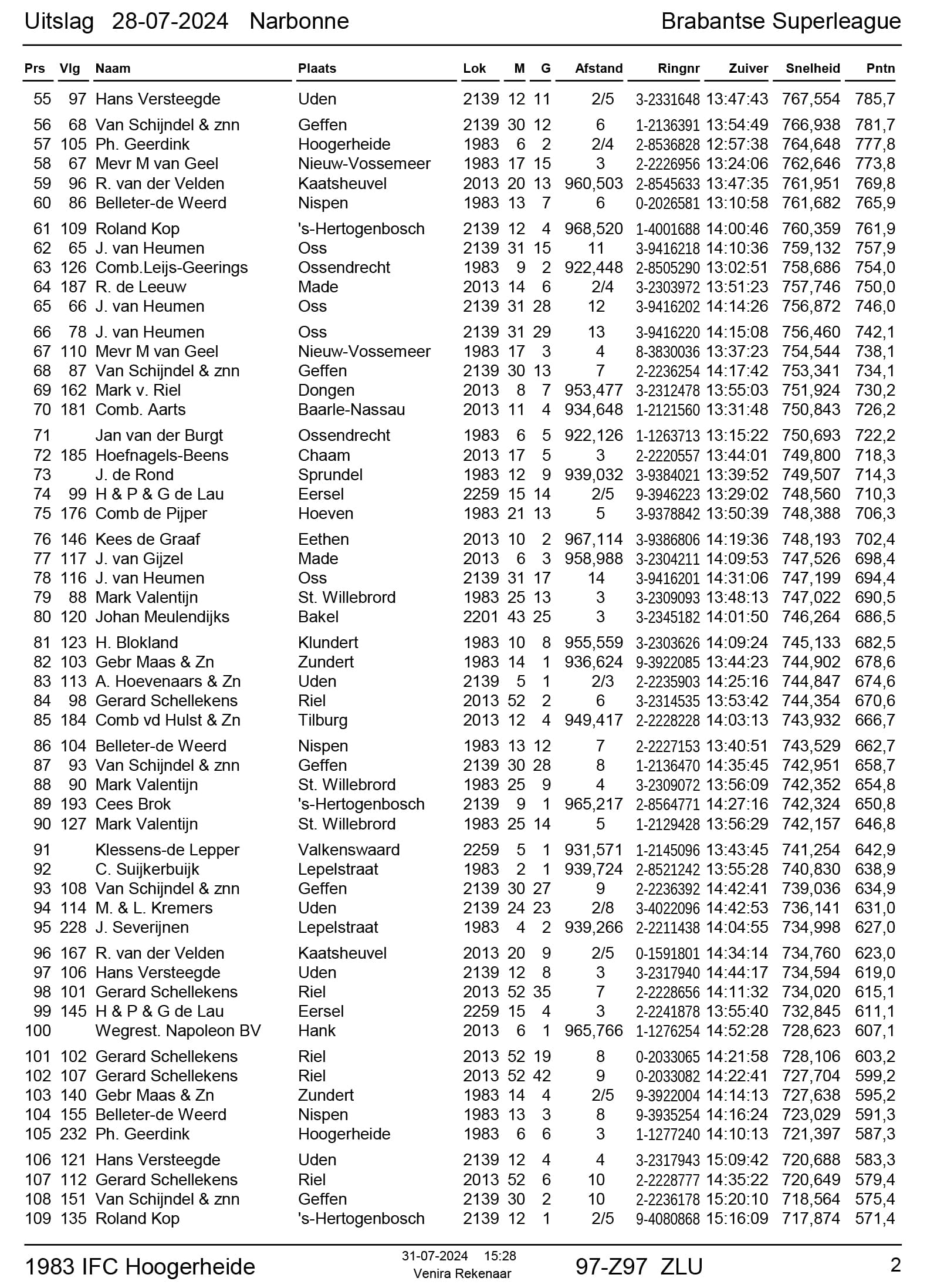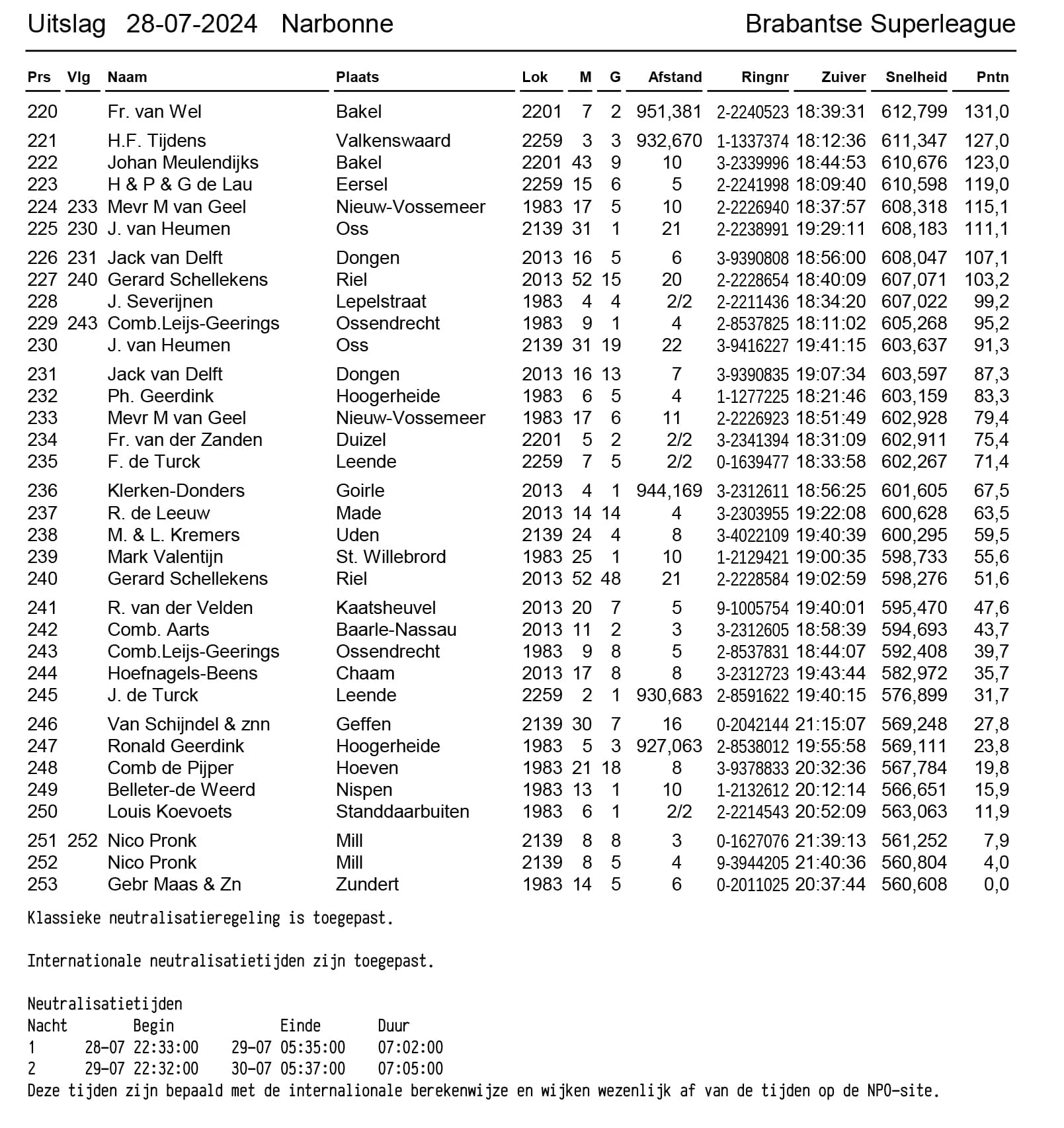 De Brabantse Superleague bracht 755 duiven aan de start, bijeen gebracht door 85 liefhebbers. Het percentage jaarlingen was dit jaar aanzienlijk minder dan voorgaande edities. De verliezen op Agen ZLU en Bordeaux zullen hier absoluut debet aan zijn. De snelste duif in tijd en meters moeten we zoeken in Dongen en wel bij sportvriend Jack van Delft, hij klokte zijn bovenste van de poulebrief om 10.27.16 uur op een afstand van 954 km, goed voor 899 mpm, oftewel 54 km per uur. Da’s geen kattenpis om met een dergelijke snelheid een concours te winnen in de Brabantse Superleague. En als ik u dan vertel dat de heer Van Delft maar 0,8 mpm overhoudt t.o.v. nummer 2, het kampioenenhok van Jeroen van Heumen uit Oss, ziet u dat elke seconde telt. Onze felicitaties gaan uit naar de triomfator van BSL Narbonne 2024, de heer Jack van Delft uit Dongen en voorts een dikke proficiat aan alle prijswinnaars in deze uitslag.