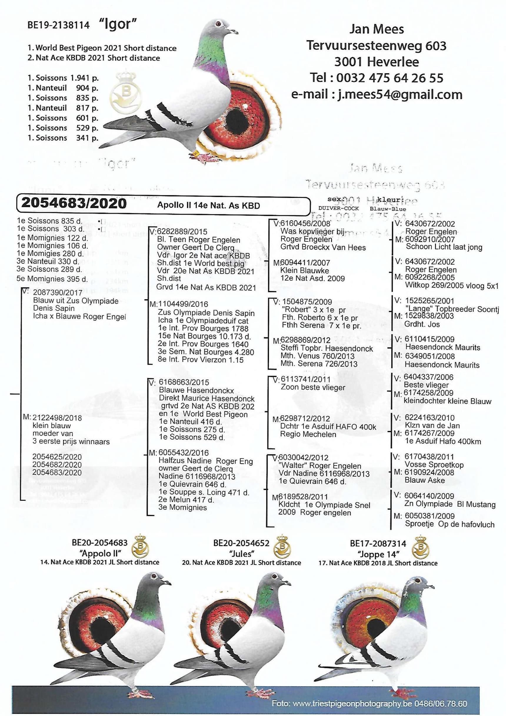 De toppers van het seizoen 2022 waren “Emile” en “Jules”, niet voor niets 2 volle broers van “Igor” en natuurlijk “Apollo I” en “Apollo 2” niet vergeten. Zit maar eens met zo 5 toppers op je hok die elke week er kunnen zijn, dan is de keuze voor 1,2 en 3 moeilijker dan goed te spelen. Maar soit, Jan vind nooit van zichzelf dat hij superduiven heeft. Maar iedereen weet natuurlijk dat dit wel is en dat we hem dit van harte gunnen.