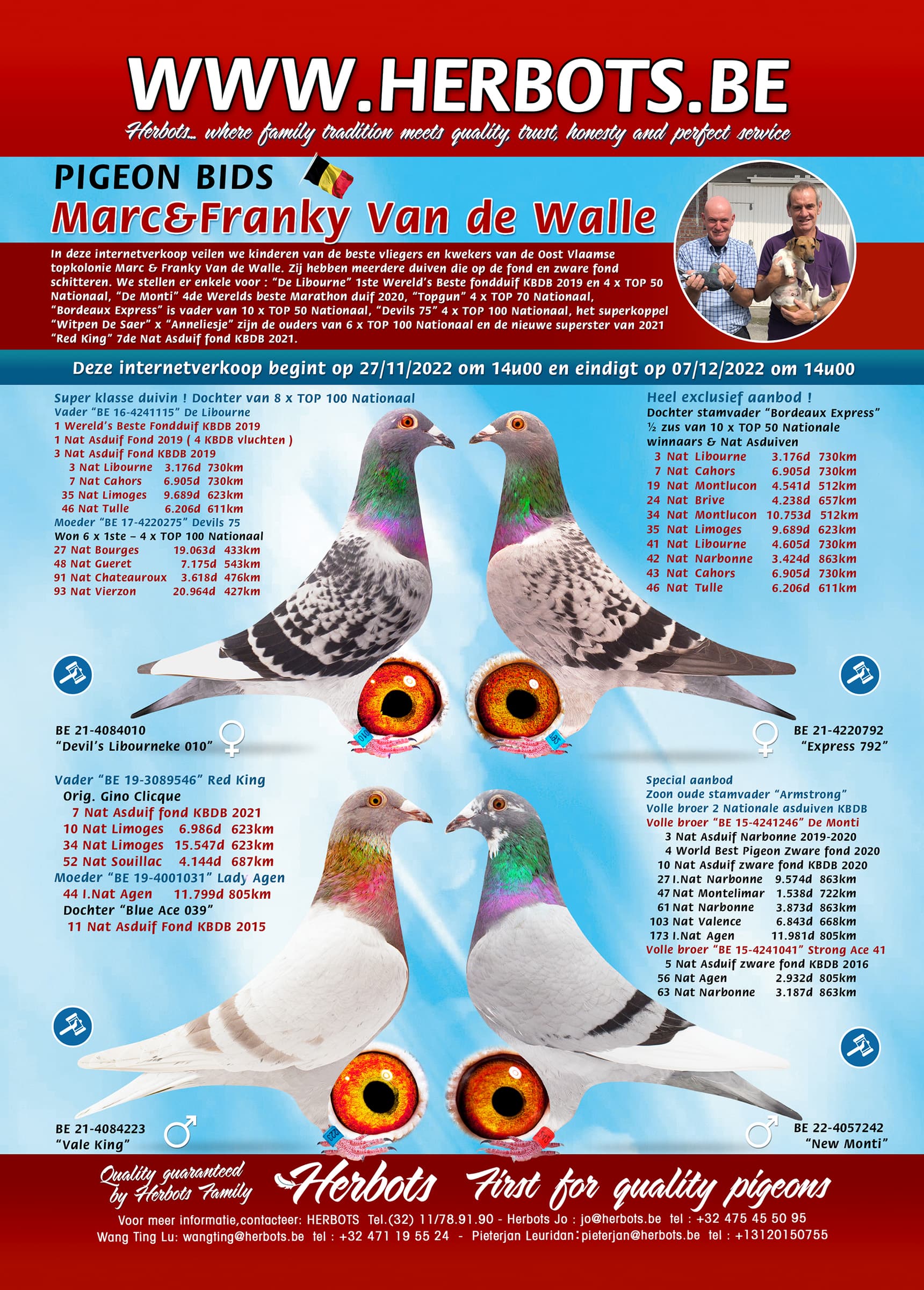 Voor de internetverkoop van Marc en Franky Van De Walle worden de duiven tentoongesteld op zondag 20/11 tussen 11u en 14u.