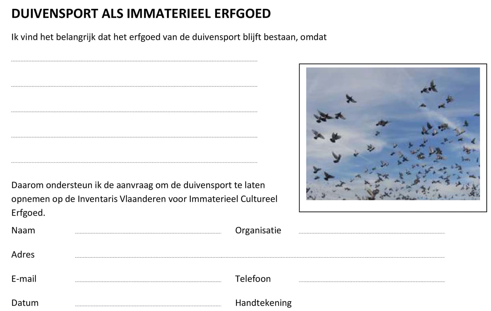 Om de duivensport als immaterieel erfgoed te laten catalogeren, rekent de KBDB op haar leden om de aanvraag kracht bij te zetten door het bijgevoegde (online) invulformulier in te vullen en door te sturen.