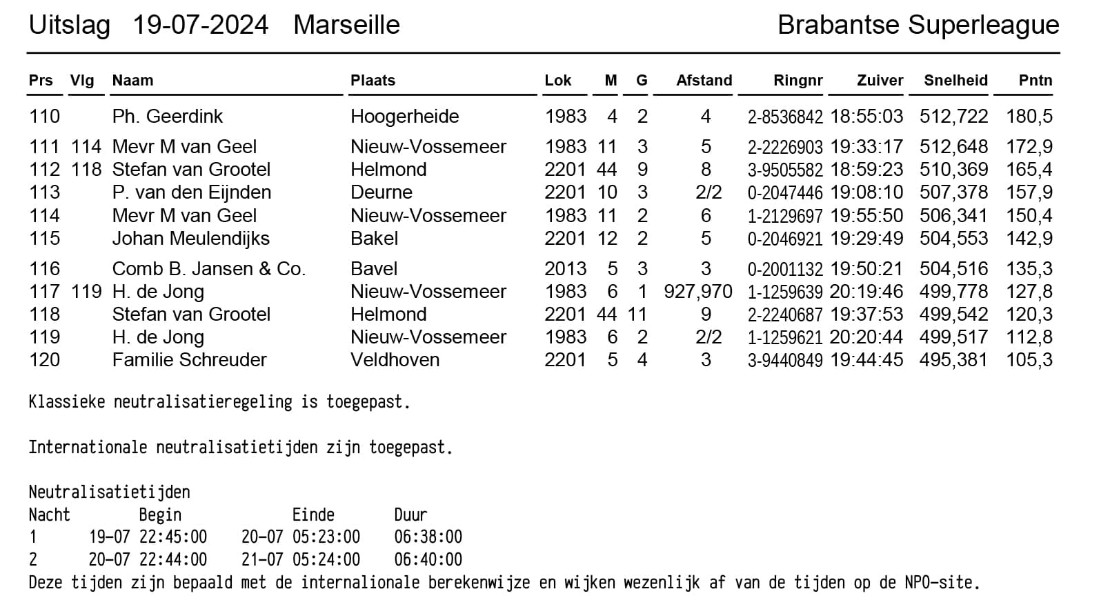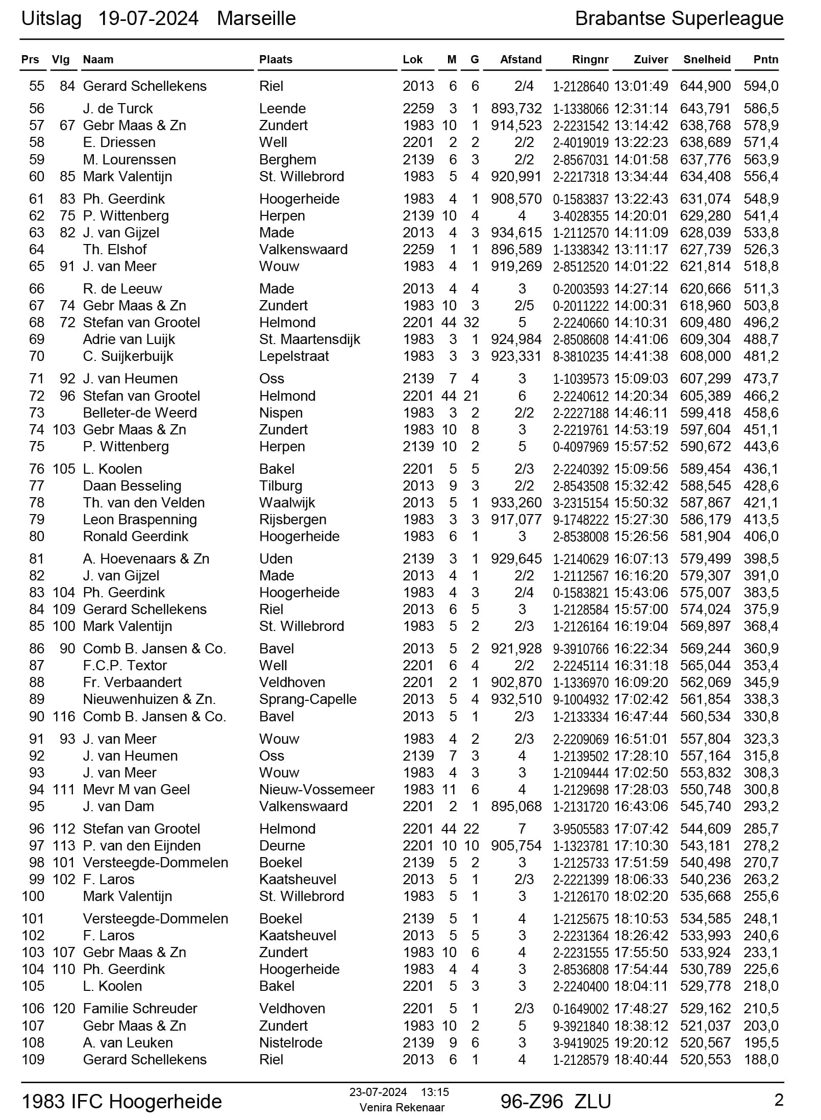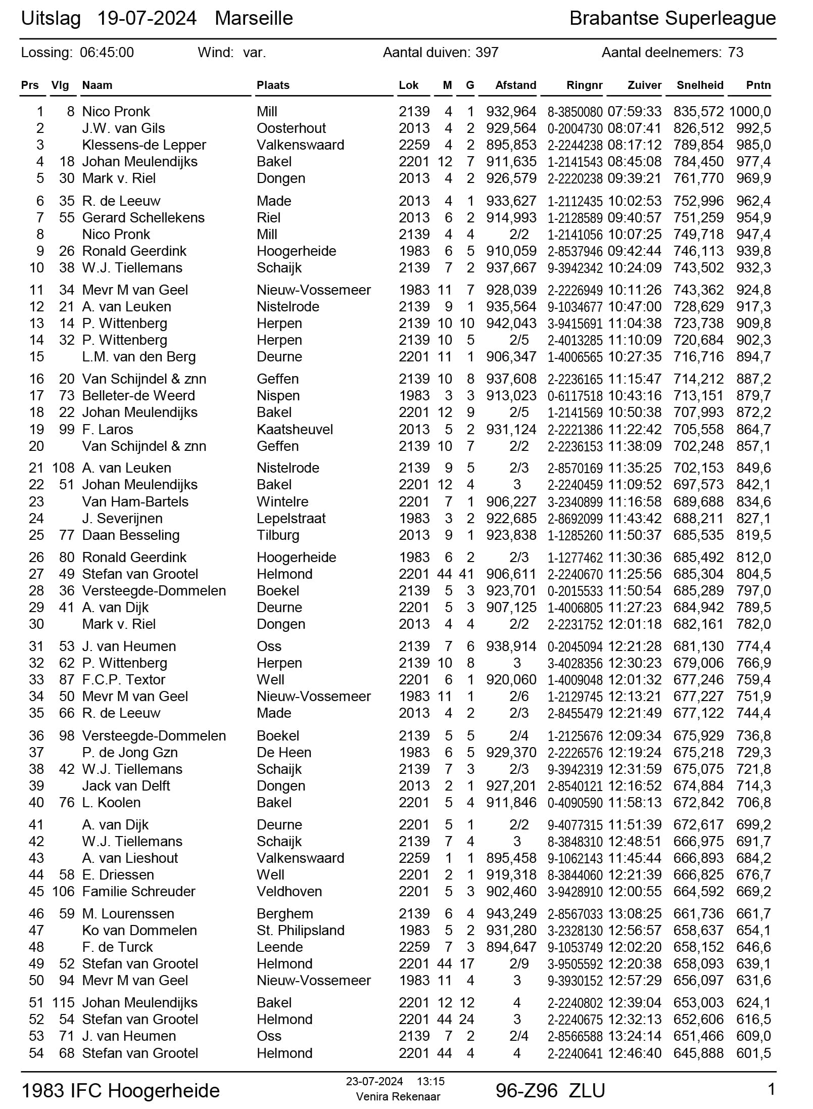 397 Duiven zouden de kleuren van onze Brabantse Superleague verdedigen op ZLU Marseille 2024. Waar zou de 1e vallen dit jaar, er zaten al vroege duiven in Limburg en in Zeeland, maar voor de 1e Brabantse duif zullen we toch echt naar het oosten van onze provincie moeten reizen en wel naar de regerend Marathonkampioen ZLU 2023, Nico Pronk uit Mill. Hij flikt het hem weer, na Agen oud schrijft Nico ook deze zware vlucht vanuit Marseille op zijn naam. Dat is geen toeval meer, geef deze topper een paar goede duiven en hij speelt je ‘het snot voor de ogen’. Reeds om 7.59.33 uur klokte Nico zijn overwinnaar op een afstand van 932 km is dit goed voor 835 mpm. Tijd zat om nummer 2 op afstand te houden. Nico, van harte gefeliciteerd met deze fantastische overwinning.