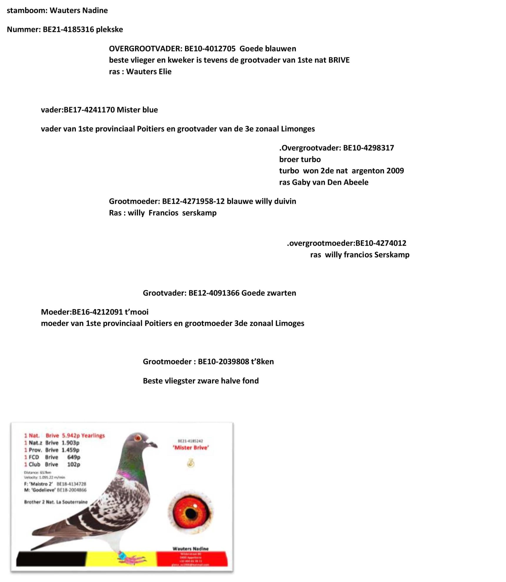 Er wordt gespeeld onder de naam Nadine Wauters maar ik overdrijf niet als we stellen dat heel de familie zeer nauw betrokken is bij de duivensport. Een teamwerk dat zijn vruchten afwerpt want de laatste jaren wonnen ze onder andere 1e Nationaal Brive jaarse en 2e nationaal La Souterraine tegen 14.215 jonge duiven met “Miss La Souterraine”. Pittig detail, de nationale winnaar Brive is een volle broer van “Miss La Souterraine”.