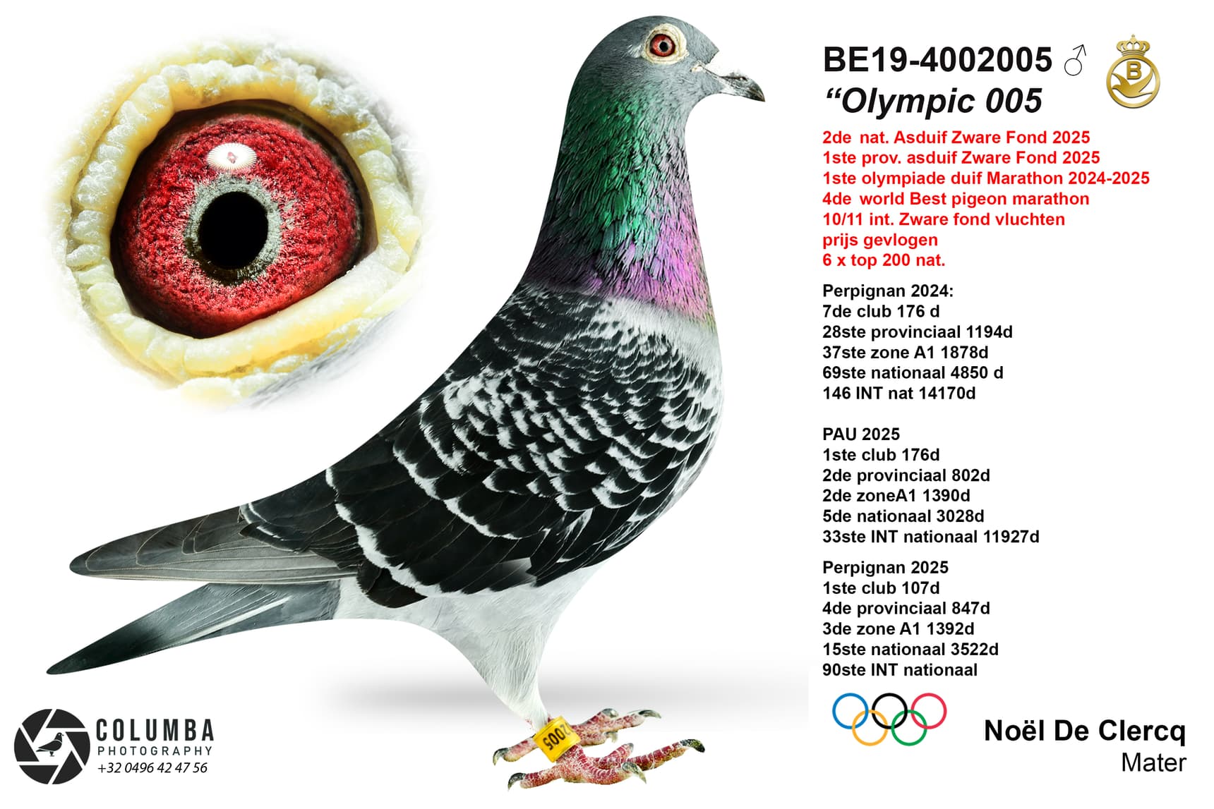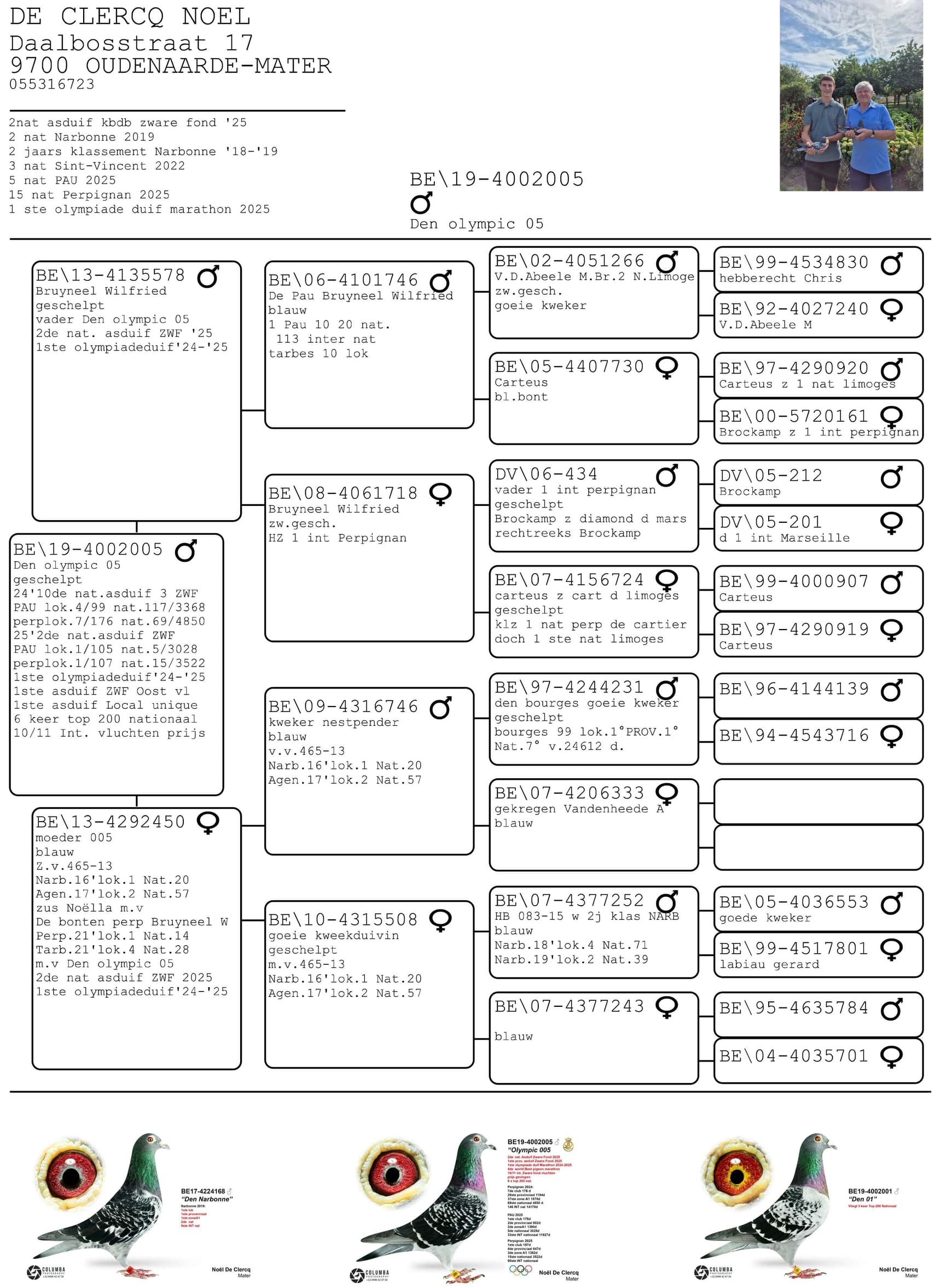 De donker geschelpte duiver met ringnummer BE19-4002005 was na zijn zeer sterke prestaties de 005 genoemd onder het motto ‘hou het maar simpel’, maar nadat hij bekroond werd tot de 1e Belgische duif op de Olympiade in Dortmund is hij officiëel herdoopt tot Olympic 005.  Het is duif met een gemiddeld gabarit, niet groot, maar met zijn 6 jaar allesbehalve beproefde spieren, een zachte pluim en een heel gepigmenteerd oog, een echte mooie duif ! Ook wel wat een nerveus type. Hij had het voorrecht om rustig te mogen uitgroeien in zijn jeugd. Als jonge duif weinig of niet in de korf, en als jaarling de normale vluchten tot 500 kilometer. Normaliter is het dan het plan dat de tweejaarse duiven naar het hok van de oude duiven gaan en de zware fond vliegen, maar door een overtal aan jaarlingen mocht hij nog een jaartje rijpen op het hok van de jaarlingen en dat programma meevliegen.  Dus is hij pas op de leeftijd van 3 jaar getest op de zware fond.  Blijkbaar had het extra jaar stage hem wel gesterkt in zijn kunnen want hij vloog in zijn carrière 10 vluchten op de zware fond en daarvan miste hij er maar eentje, namelijk zijn eerste. Nadien was hij 9 keer paraat waarvan enkele keren knettervroeg op de uitslag. Als bekroning zeker de titel van 2e nationale asduif zware fond en 1e Belgische duif op de Olympiade Dortmund in de categorie fond. Wat Noël ook wou toevoegen bij dit alles is het feit dat op Perpignan 2026 zijn 005 voor het eerst in zijn leven tijd heeft verloren bij thuiskomst.  Vooreerst stelt Noël dat hij alle respect heeft voor de 1e nationale asduif van Mevrouw Deweerdt & Zonen en geen enkel resultaat betwist. In de vorige vluchten aarzelde de 005 nooit bij thuiskomst en was hij steeds razendsnel geklokt,  maar op de ochtend van 3 augustus om 9 u 22 kwam hij uit de oostelijke richting en toerde nog een drietal keer rond het huis vooraleer hij zin had om binnen te komen. Was het de euforie van het thuiskomen, de voldoening van deze topprestatie die hem tot deze ererondes dreef ? Niemand zal het weten, maar het verschil met de eerste asduif is heel nipt.  Soit, c’est la vie…en iedere speler heeft dit al wel eens voor in zijn carrière, maar met de titel van 2e nationale asduif, 1e provinciale asduif, 4th World Best Pigeon, 1e Olympiadeduif België is zijn diploma netjes gevuld !