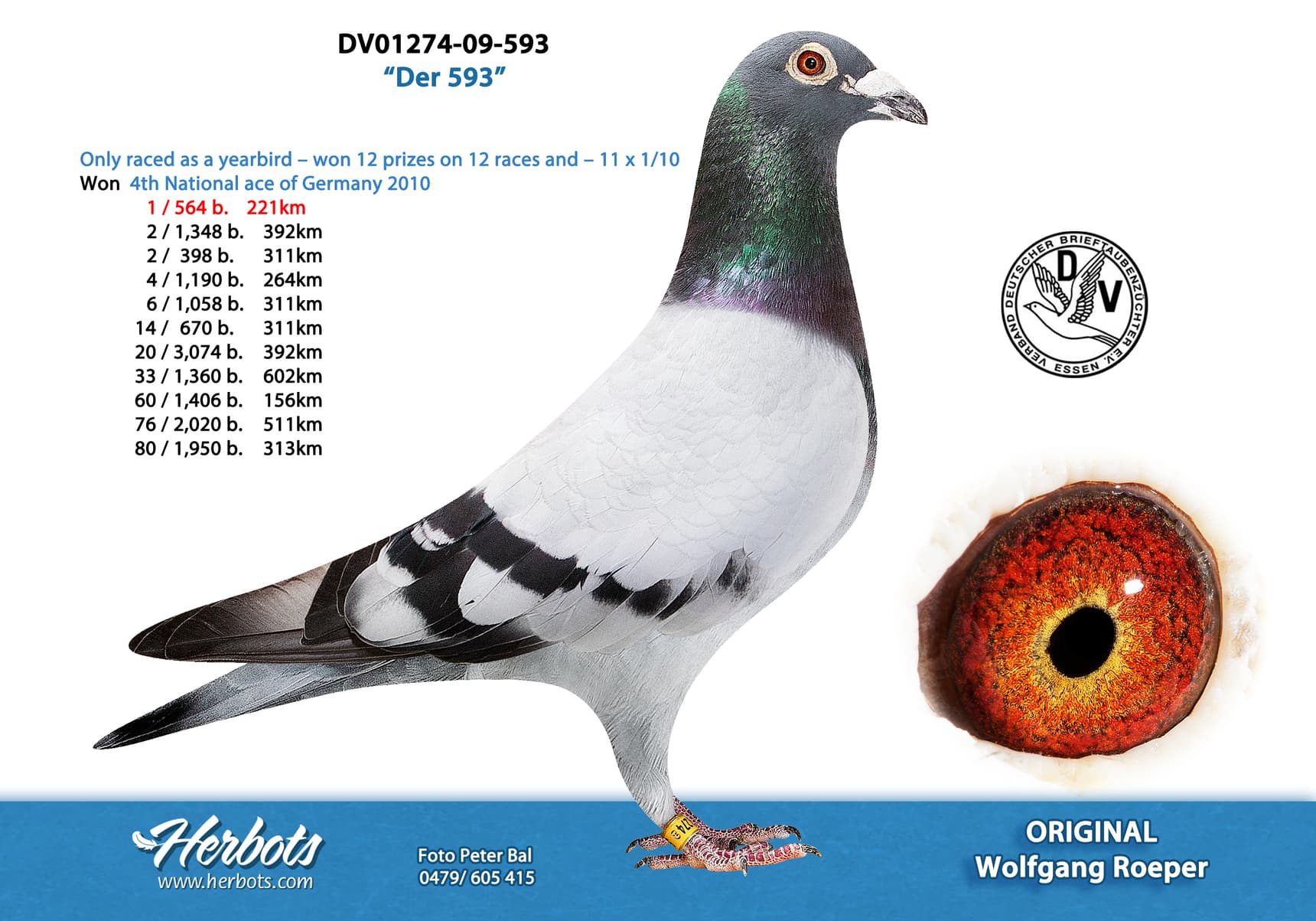 “Der 593” DV01274-09-593 werd enkel als jaarse duif gespeeld en won 12 prijzen op 12 inkorvingen waarbij 11 x 1/10.