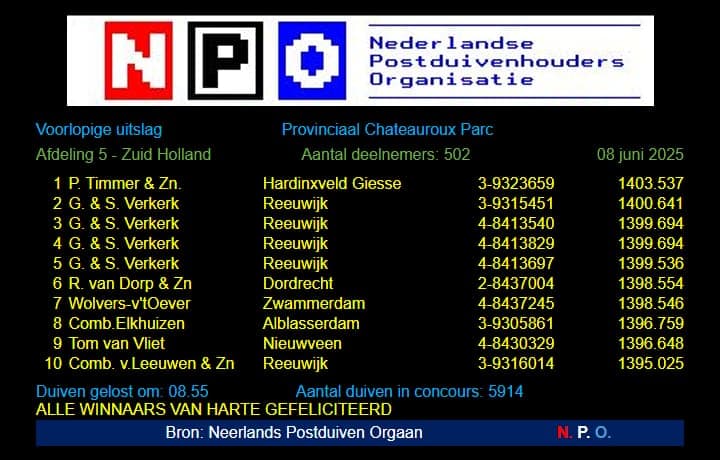 p. timmer & zn. (hardinxveld): behalen de overwinning tegen 5914 duiven uit châteauroux!