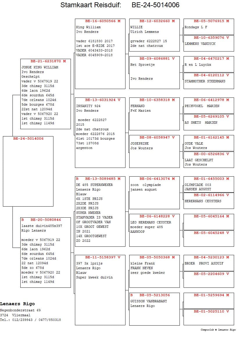 Op de nationale vlucht vanuit Bourges won Rigo Lenaers de 1ste Nat (z) Bourges tegen 1.383 jaarlingen met een jaarse duivin uit een bewezen topkoppel. Meerdere broers en zussen van dit kweekkoppel zijn bewezen duiven op kortere vluchten maar ook verdere nationale vluchten. Dit zijn opnieuw nazaten van zijn stamvader “Super 485”, die een kleinzoon is van “Olympiade 003” van Leo Heremans. Deze bloedlijn gekruist met andere duiven is voor Rigo een succes verhaal dat voor hem fantastisch lukt. Ook andere gewestlijke overwinningen rijft hij aan elkaar met vorig weekend nog 7 eerste prijzen gewestelijk.