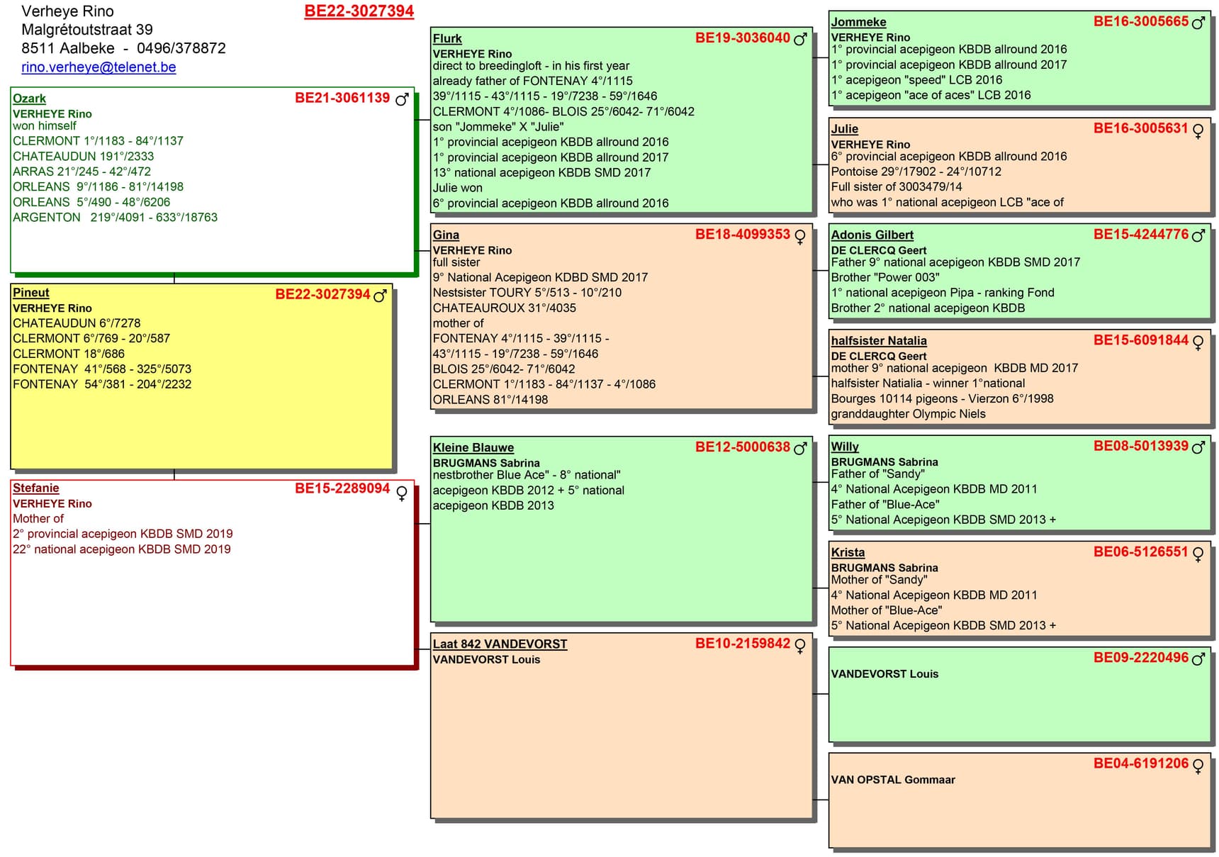 Zoon van “Flurk” is zoon van stamvader “Jommeke” x “Gina” is volle zus van 9 Nat Asduif H.F. KBDB 2017 bij Geert De Clercq