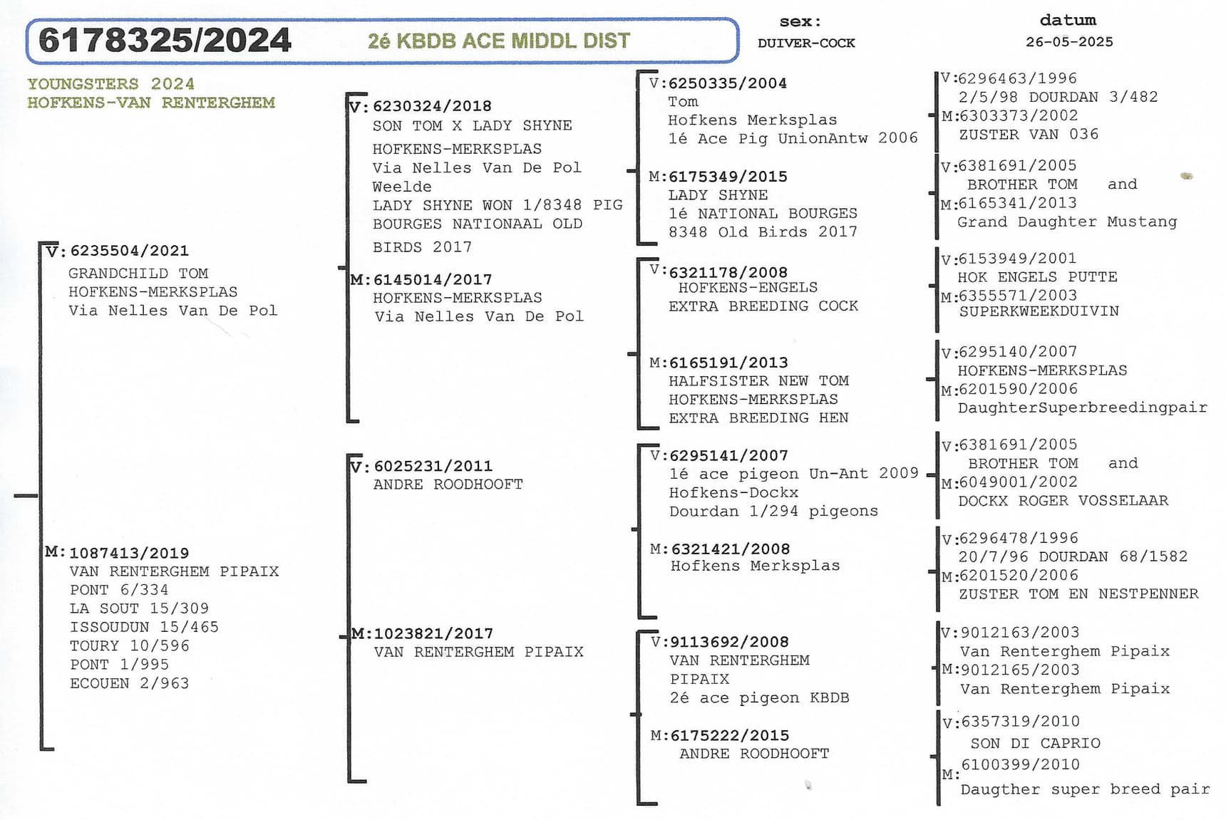 Dochter van “231/11” Inteelt Tom Andre Roodhooft x “821/17” Van Renterghem x Andre Roodhooft