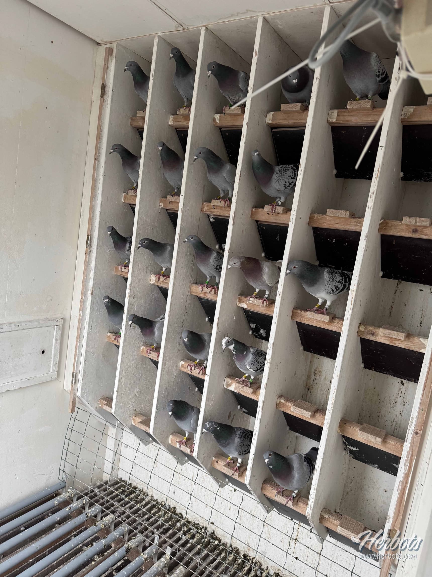 Ik zet alle bakken van de doffers open zodat deze in de schotel kunnen gaan liggen en dan ga ik naar het hok van de duivinnen, daar zet ik de deuren allemaal open zodat ze naar de doffers kunnen en vanaf dan begin ik de eerste duiven al in te pakken. Ze weten maar al te goed wat er aan de hand is, de laatste duiven zitten dan 10 a 15 minuutjes samen.