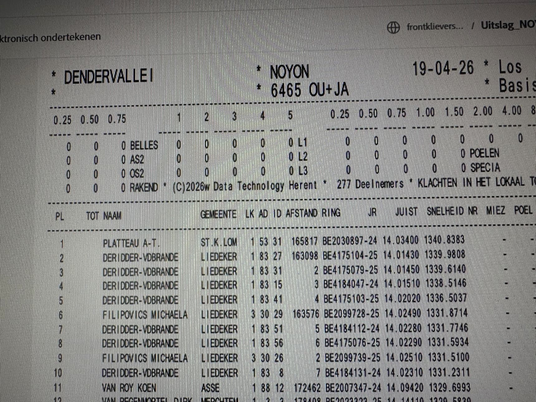 Sinds de eerste vluchten staan Tom en Ante Platteau aan de inkorftafel en de concurrentie heeft het geweten want onmiddellijk was het er boenk op. Ondanks het seizoen nog zeer pril is, staan er al verschillende 1e prijzen op het 2026-palmares waarbij – voorlopig – de mooiste behaald werd vanuit Noyon tegen 6.465 oude en jaarse duiven ingekorfd door 277 deelnemende liefhebbers