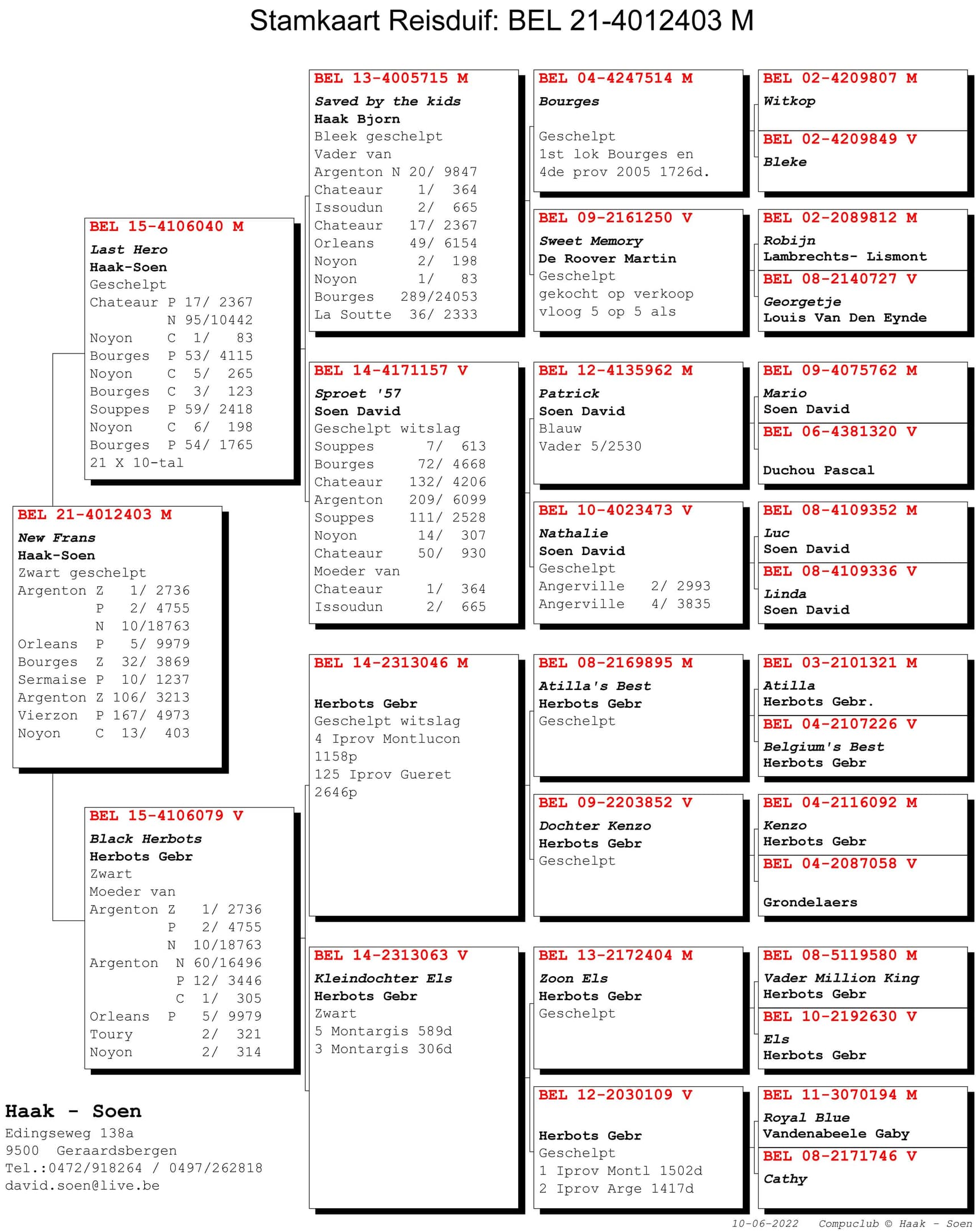 Geraardsbergen: Zoals naar jaarlijkse gewoonte waren ze opnieuw super bezig en dan hebben we het over de tandem Bjorn Haak en David Soen. Hun pijlen hebben ze op de grote halve fond vluchten gericht en we kunnen stellen dat ze perfect weten waarmee ze bezig zijn. Voor de eerste nationaal vlucht van 2022 hadden ze 24 duiven in de korven en maar liefst 10 wonnen (lokaal) per tiental en 22 wonnen per 3-tal. Een beloftevolle start zoals ze zeggen en 1 week later was het al bingo want “New Frans” (B21-4012403) schitterde met 1e Nationaal (z) tegen 2.736 jaarse duiven.