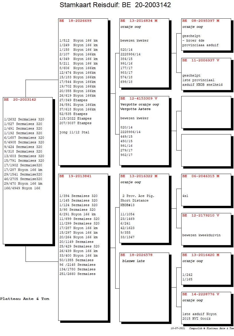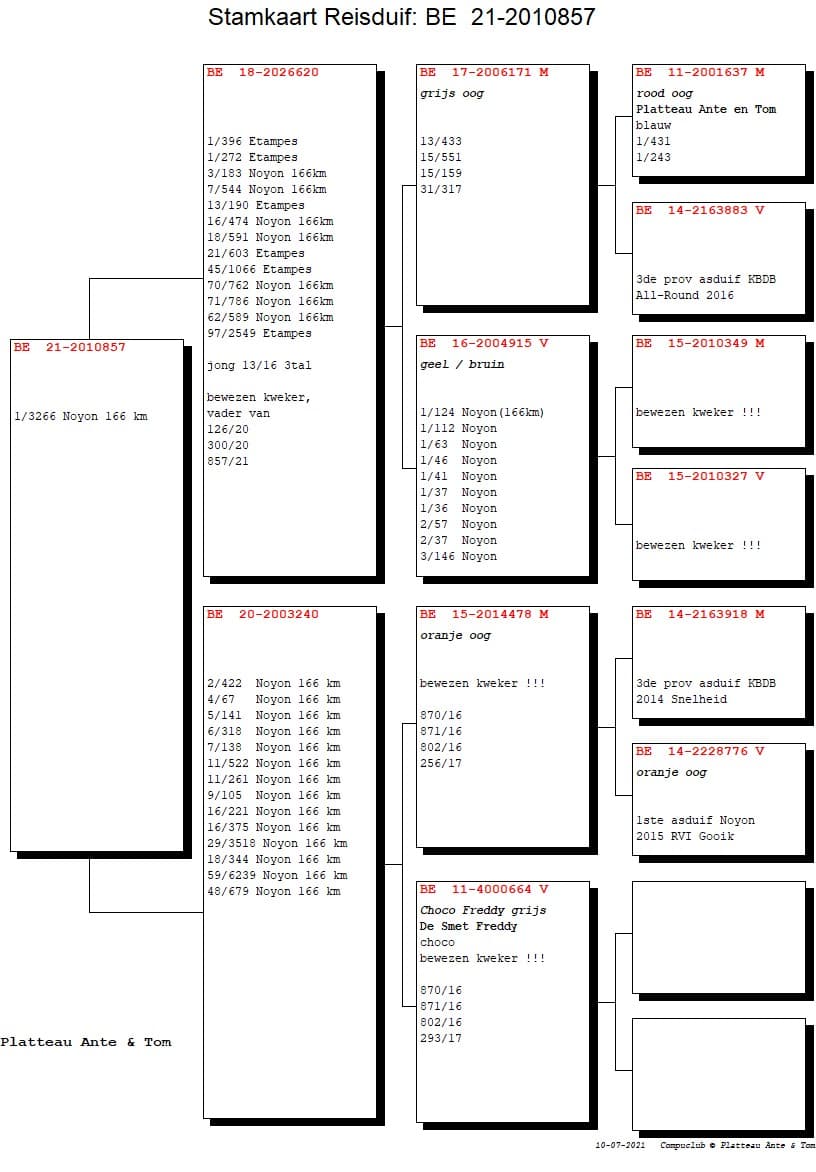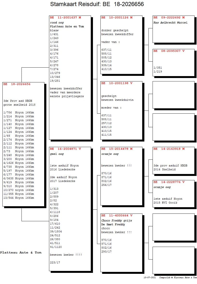 Is zelf een bewezen kweker, ook half-broer van de 3de Provinciale Asduif Snelheid KBDB en zoon van BE16-2004871: 3de Provinciale Asduif All-Round 2016 – 1ste Asduif Noyon Liedekerke 2016 en bewezen kweekduivin, zij is oa. moeder van BE18-2026656 3de Provinciale Asduif Grote Snelheid KBDB 2018 (zie pedigree)