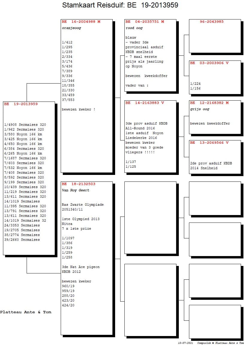 We beginnen met de BE19-2030959, deze crack won op 08/05/2021 de 1ste Sermaises tegen 4.908 oude duiven. Zijn volledige palmares met 2x 1ste, 2x 3de, 1x 4de, 2x 6de, 4x 7de , … kan je nakijken op de onderstaande pedigree.
