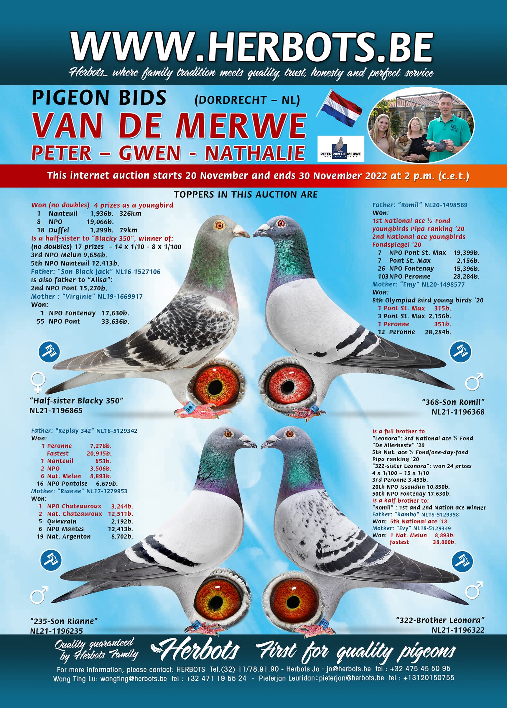 Begin december 2021 was er de succesvolle verkoop van Peter Van de Merwe. Voor de start van de verkoop werd duidelijk gesteld dat er nog enkele oudere en enkele jongere duiven van de gekende “zwarte soort” gingen behouden worden en met deze duiven zijn dan vader Arie en dochter Gwen zich gaan bezig houden, dit terwijl Peter volop aan het recupereren was van zijn zware rugproblemen. De ongekende ervaring van opa Arie en het jeugdig enthousiasme van dochter Gwen blijkt de perfecte cocktail voor succes te zijn want het seizoen was nog maar enkele weken oud toen hun duiver "Arie" (NL21-1196123) de 1e NPO Pont St Maxence (snelste van 35.038d.) won en nogmaals enkele weken later was top duivin "Janne" (NL21-1196134) die de NPO zege tegen 3.934 duiven vanuit Chateauroux naar huis bracht. "Janne" was tevens de snelste van 5.369d.