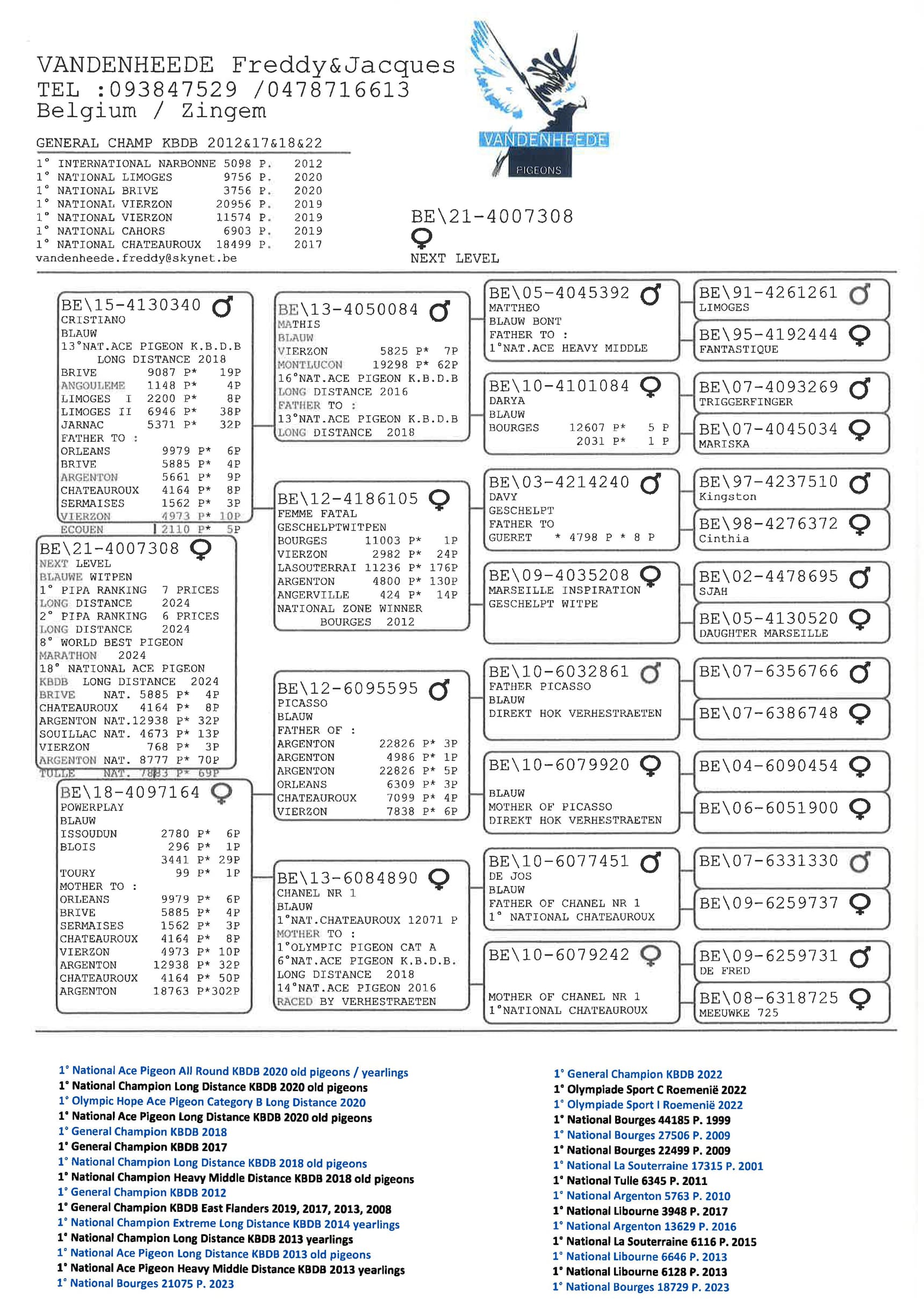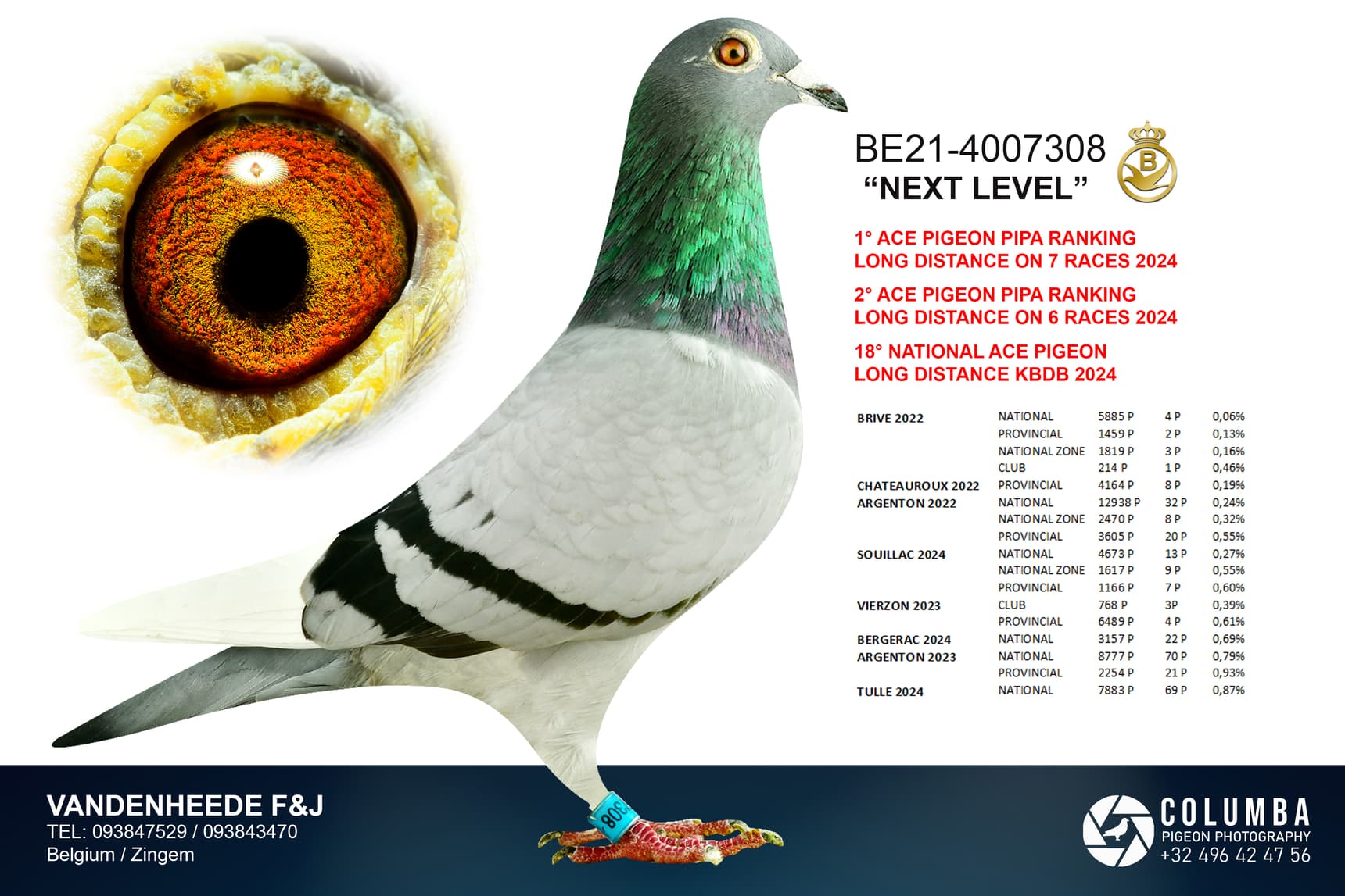 - Beste duif op 7 nationale fondwedstrijden met Next Level 21-4007308 / was ook de enige met 7 topresultaten