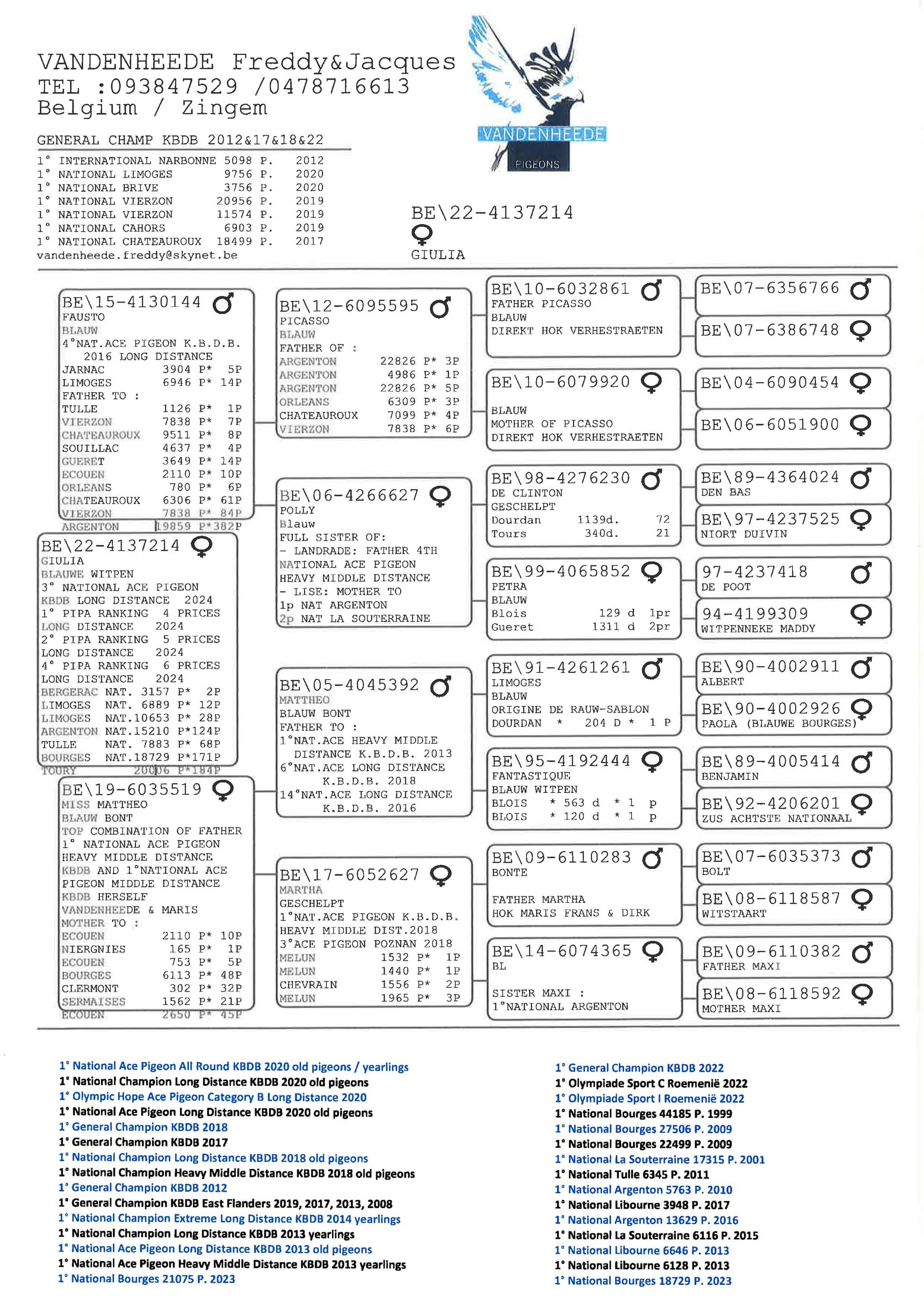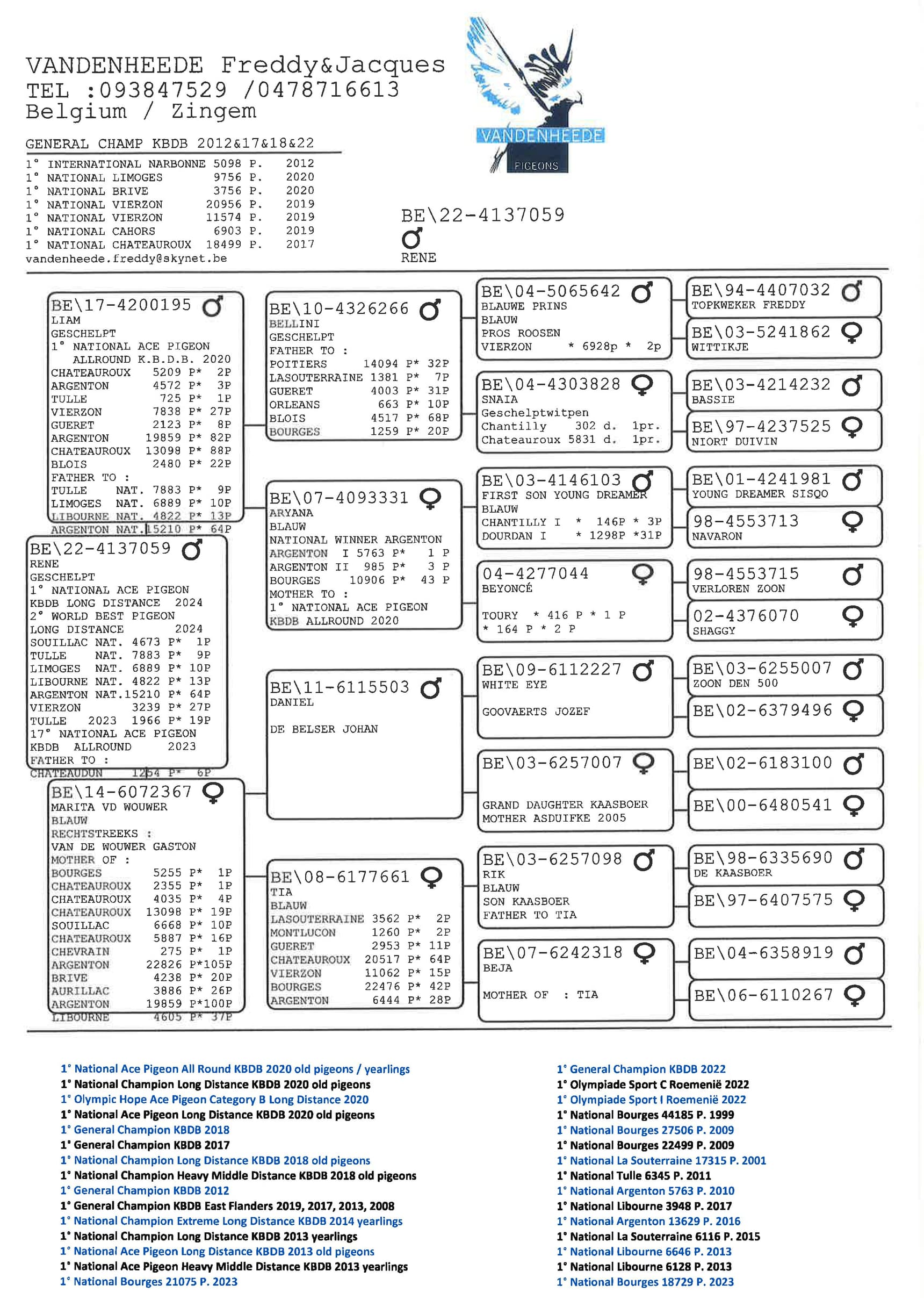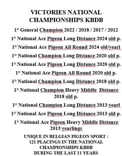 vandenheede freddy & jacques (kruisem) : 1e nationale asduif kbdb fond oude ‘24 en 1e nationale asduif kbdb allround oude & jaarse ‘24