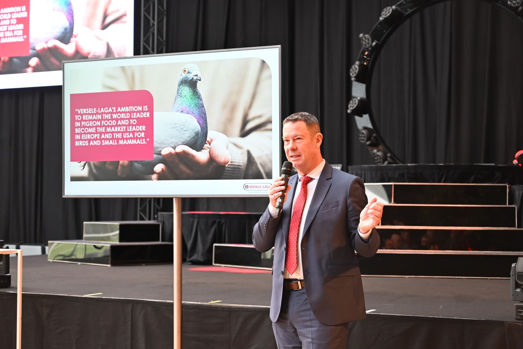 Maar er was nog een reden om "het beste pak" aan te trekken. Zoals iedereen weet is Versele-Laga niet enkel de nr. 1 wereldwijd in de duivenvoeding maar hebben ze tevens een zeer groot aandeel in markt van de honden- , katten-, vogels-, paarden- en kleine huisdieren voeding .