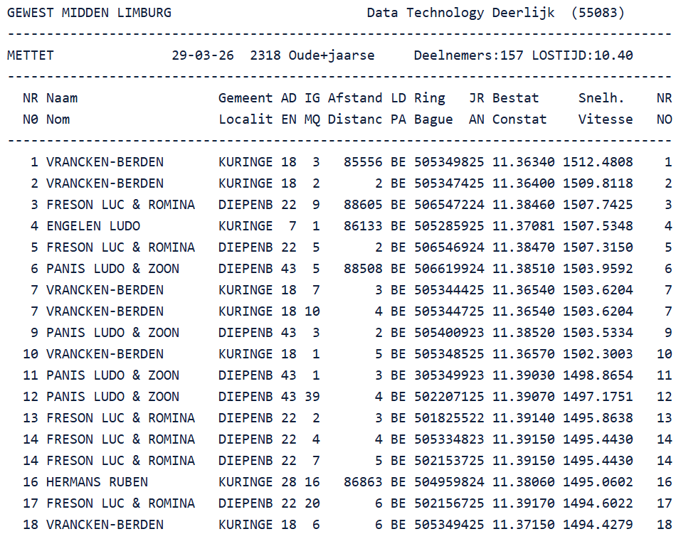 vrancken – berden (kuringen) herhaalt zijn stunt met 1ste en 2de s.prov. mettet 2.318 oude en jaarse duiven