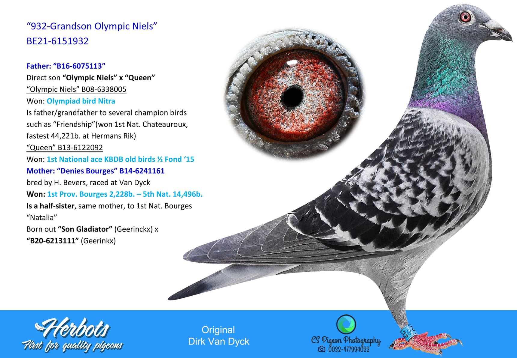 Is father/grandfather to several champion birds such as “Friendship”(won 1st Nat. Chateauroux, fastest 44,221b. at Hermans Rik)