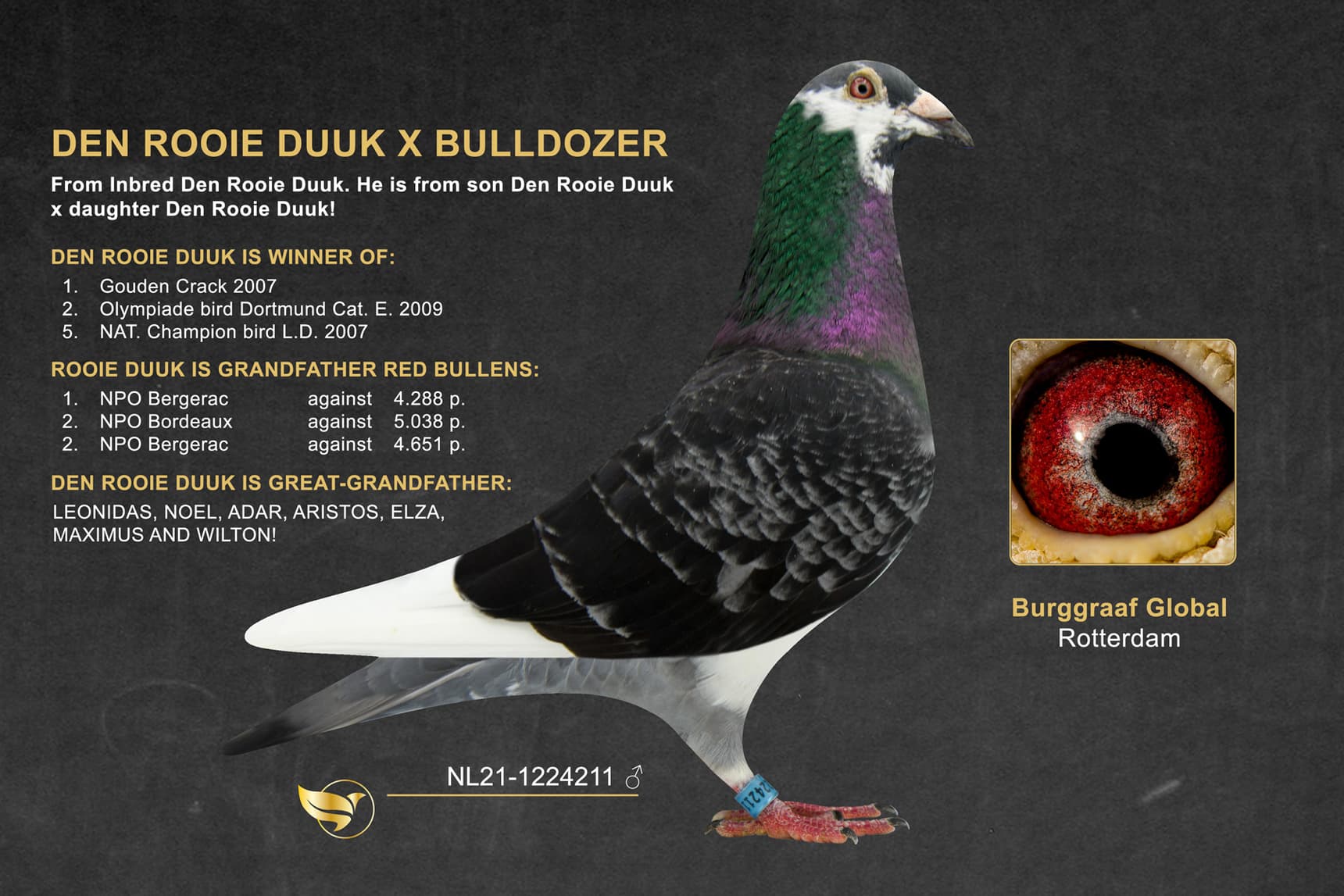 Inbred to Den Rooie Duuk. He was just like his grandson Red Bullens a phenomenal racer on the marathon! Also he grew into an absolute legendary breeder in the pigeon sport. Grandchildren, great-grandchildren and great-great-grandchildren fly at the national top.