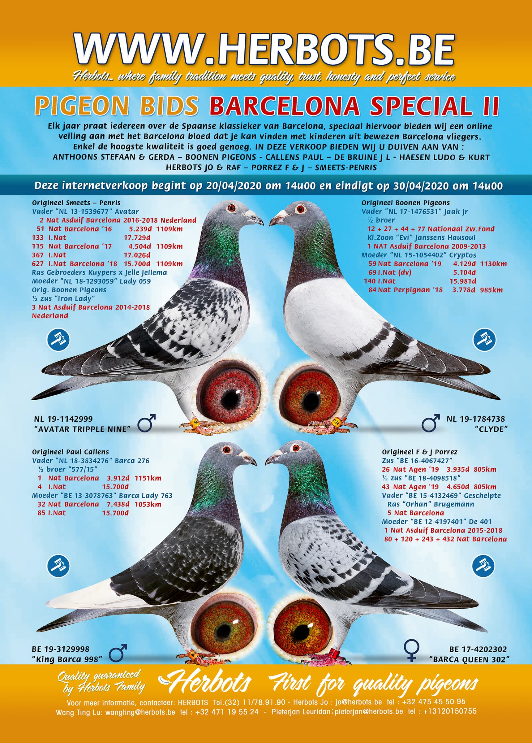 Elk jaar praat iedereen over de Spaanse klassieker van Barcelona, speciaal hiervoor bieden wij een online veiling aan met het Barcelona bloed dat je kan vinden met kinderen uit bewezen Barcelona vliegers. Enkel de hoogste kwaliteit is goed genoeg. IN DEZE VERKOOP BIEDEN WIJ U DUIVEN AAN VAN :