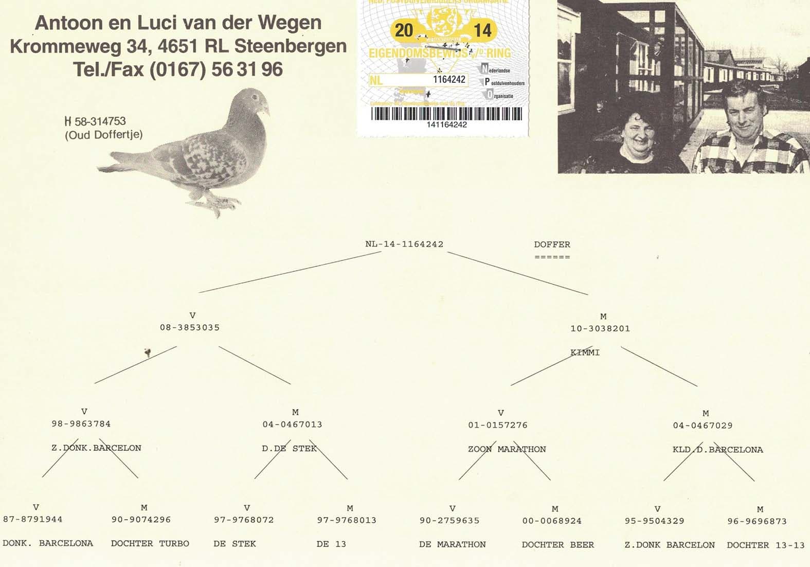 Inbred to “Donkere Barcelona”, winner of 25th Nat. Perpignan 7,580b. - 48th Internat. Perpignan 18,447b. – 34th Nat. Perpignan 8,102b. - 63rd Internat. Perpignan 27,167b. – 65th Nat. Perpignan 3,448b. – and so on