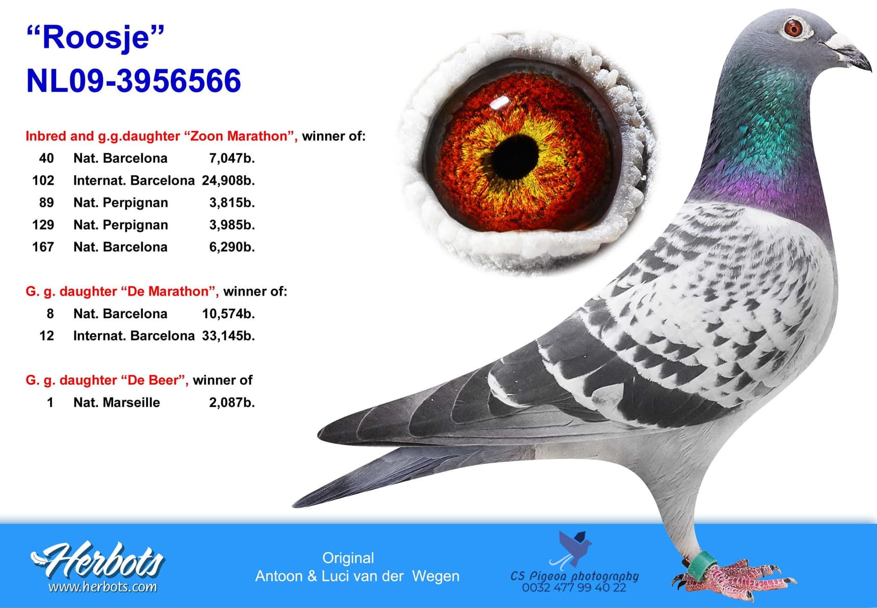 Inbred to “Zoon Marathon”, winner of 40th Nat. Barcelona 7,047b. - 102nd Internat. Barcelona 24,908b. – 89th Nat. Perpignan 3,815b. - 167th Nat. Barcelona 6,290b.