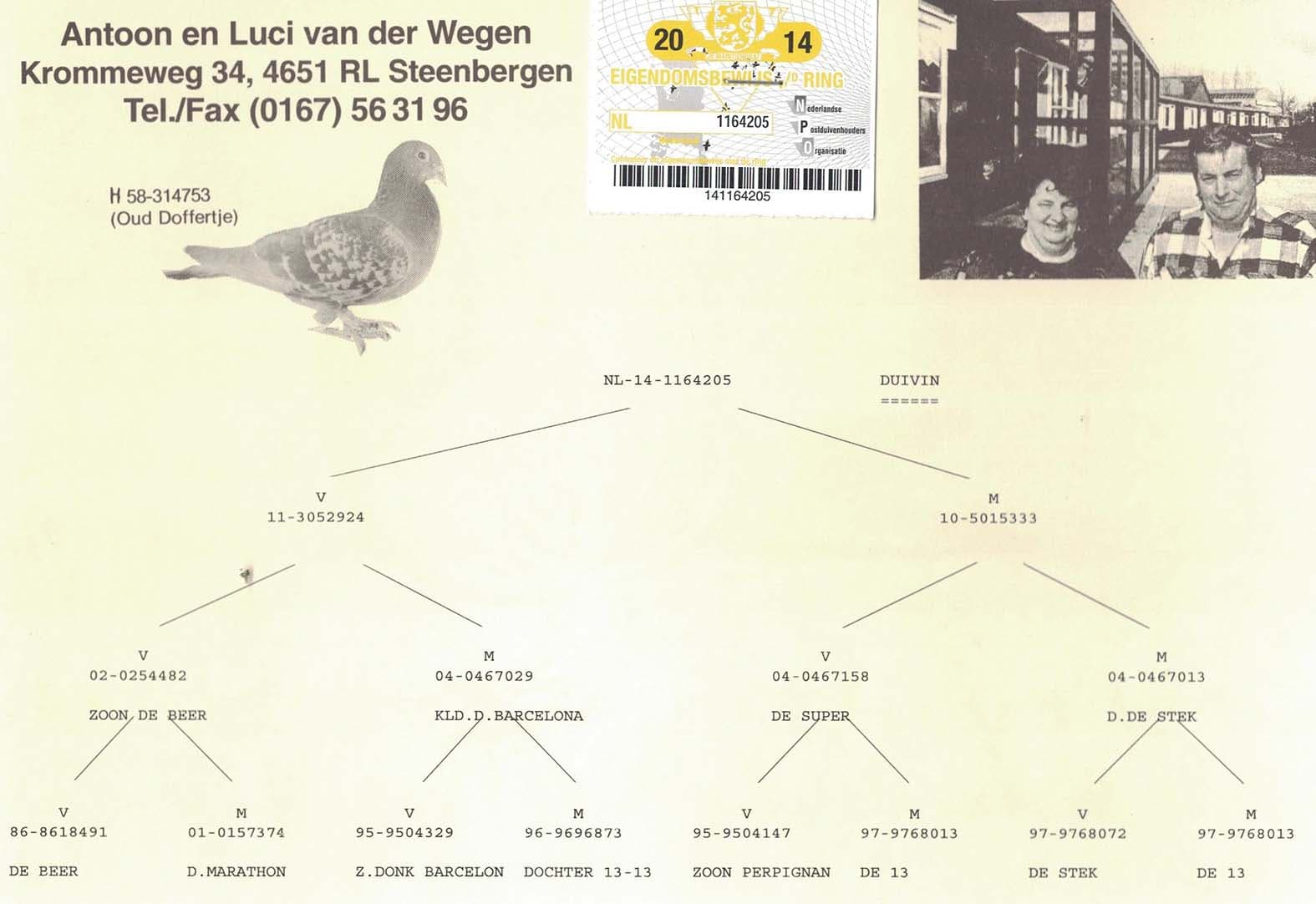 Direct son of “Kleinzoon Lucia”, winner of 15th Nat. and 67th Internat. Perpignan 17,624b. – 21st Tarbes ZLU 3,601b. – 139th Nat.Pau