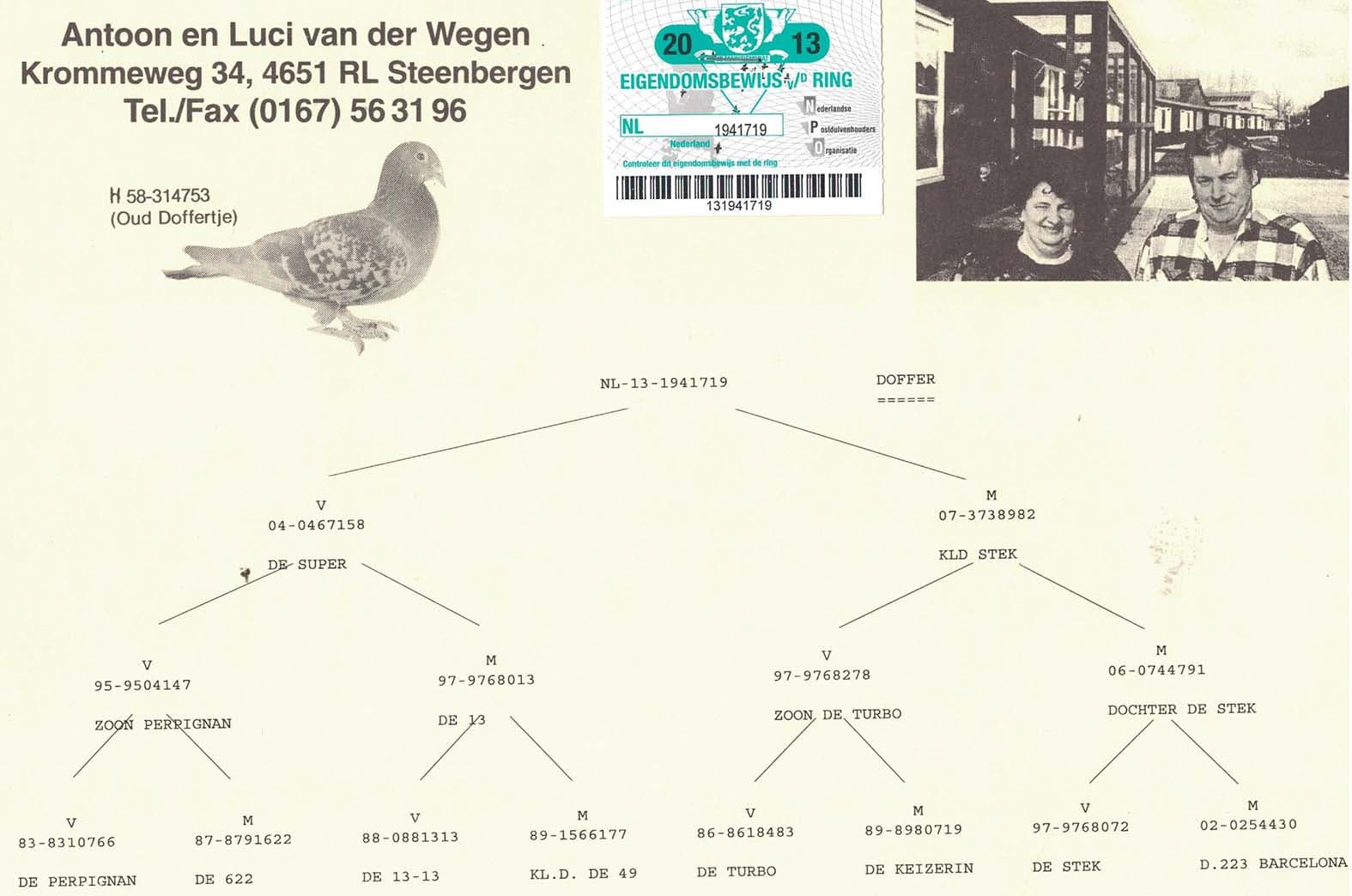 Born out “De Super” (grandson of “De Perpignan”:2nd Nat. Perpignan) x “Kleindochter De Stek” ( a granddaughter “De Turbo” : 1st Nat. Pau - and also granddaughter “De Stek”: 1st Nat. Dax 4,108b. – 19th Internat. Dax 12,880b.)