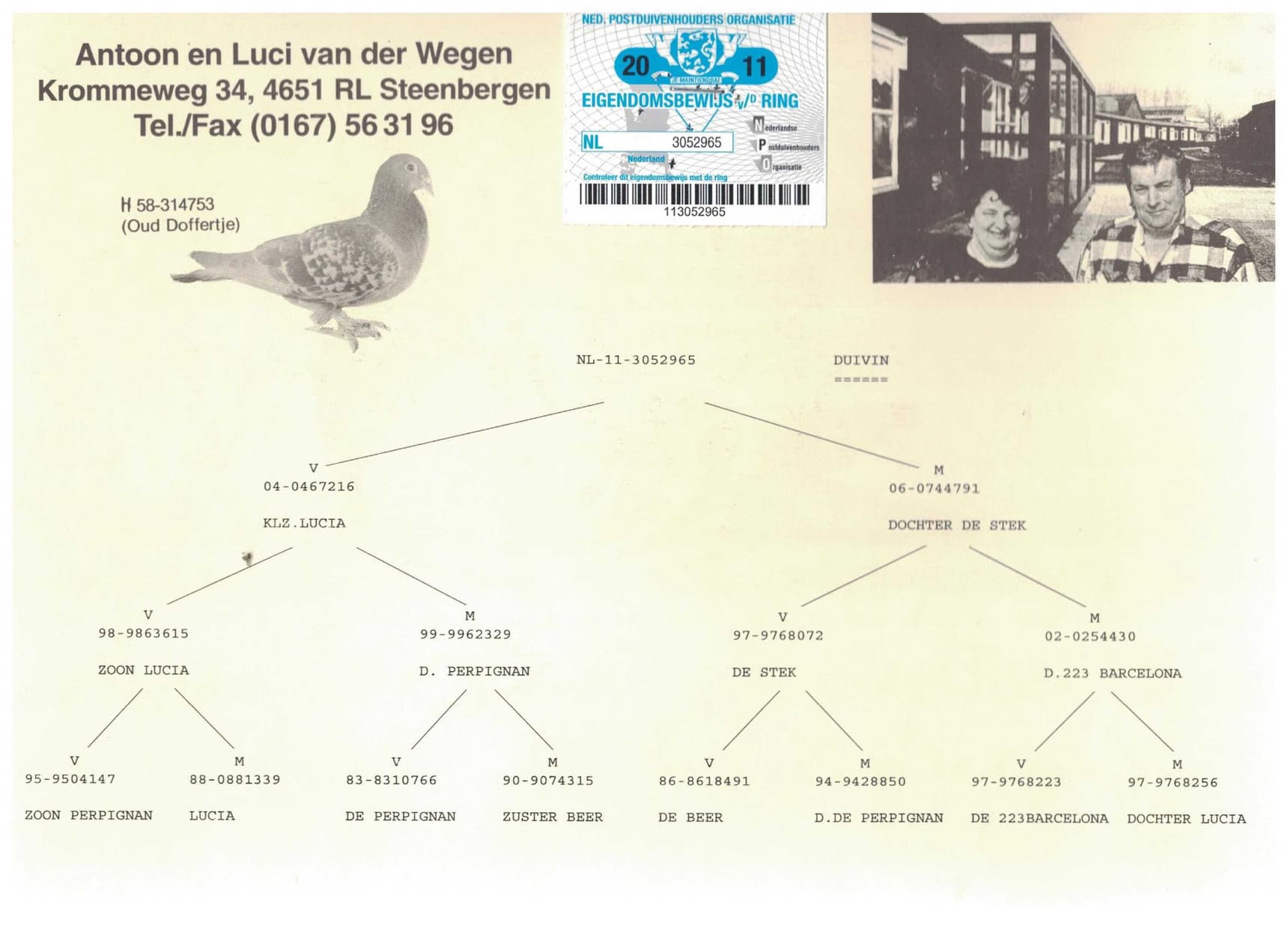 Direct son of “kleinzoon Lucia”, winner of 15th Nat. and 67th Internat. Perpignan 17,24b. – 21st Tarbes ZLU 3,601b. – 139th Nat. Pau