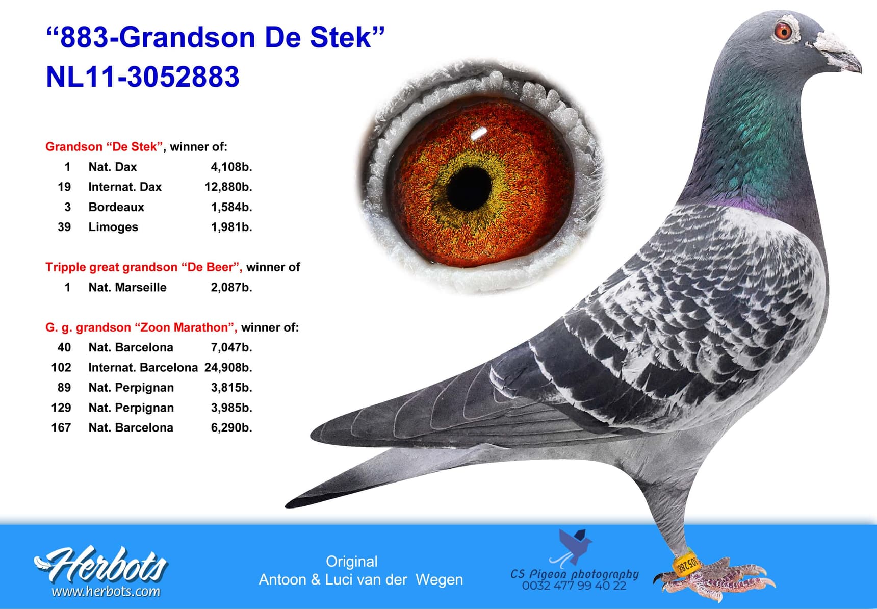 Granddaughter “De Europeaan”, winner of 32nd Nat. Barcelona 8,042b. - 79th Internat. Barcelona 27,669b. – 49th Nat. Perpignan 6,507b. – 54th Nat. Barcelona 7,016b.