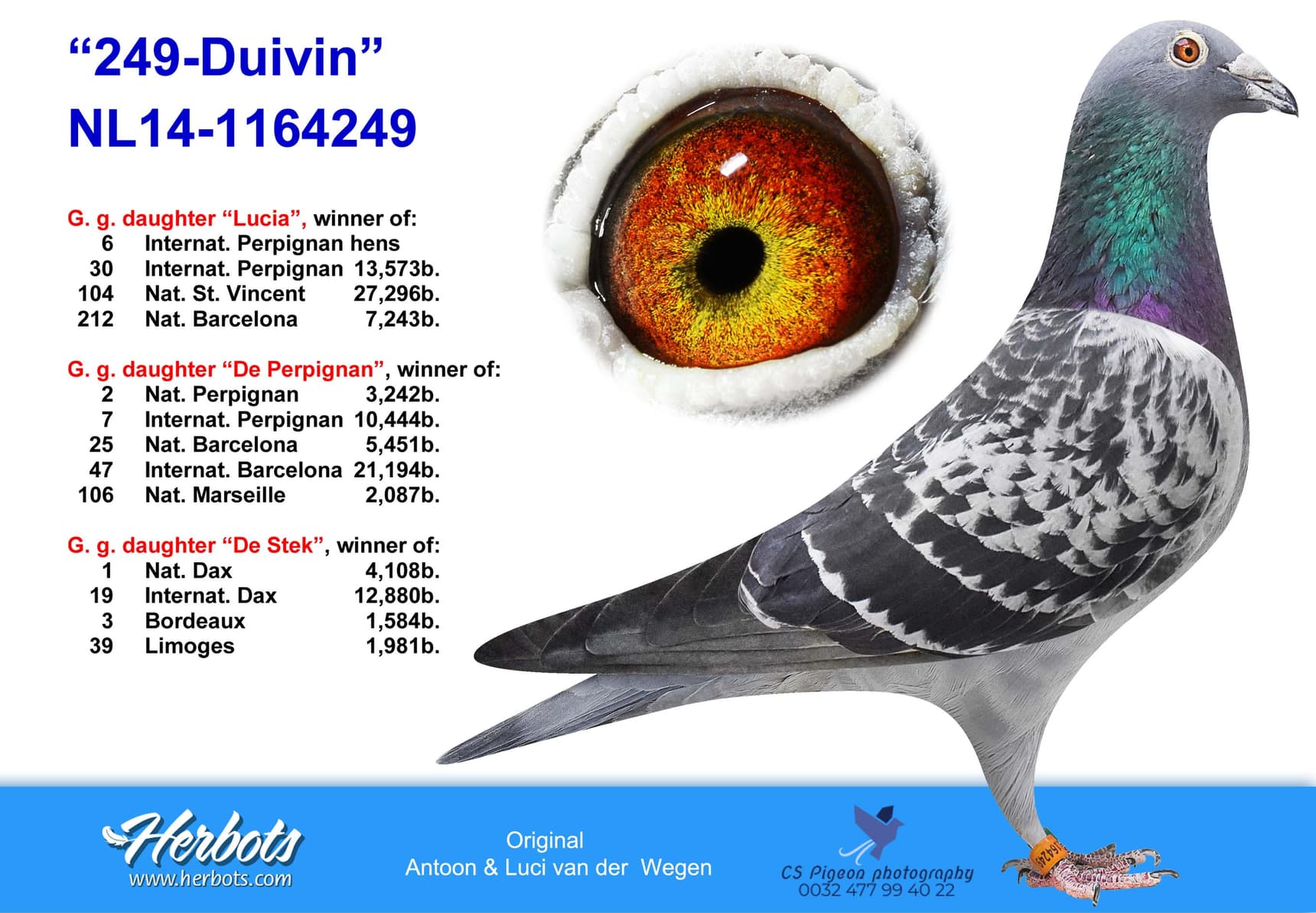 Direct son of “Witpen Barcelona”, winner of 10th Nat. Barcelona 7,073b. – 28th Internat. Barcelona 23,708b. – 36th Nat. Narbonne 2,563b.